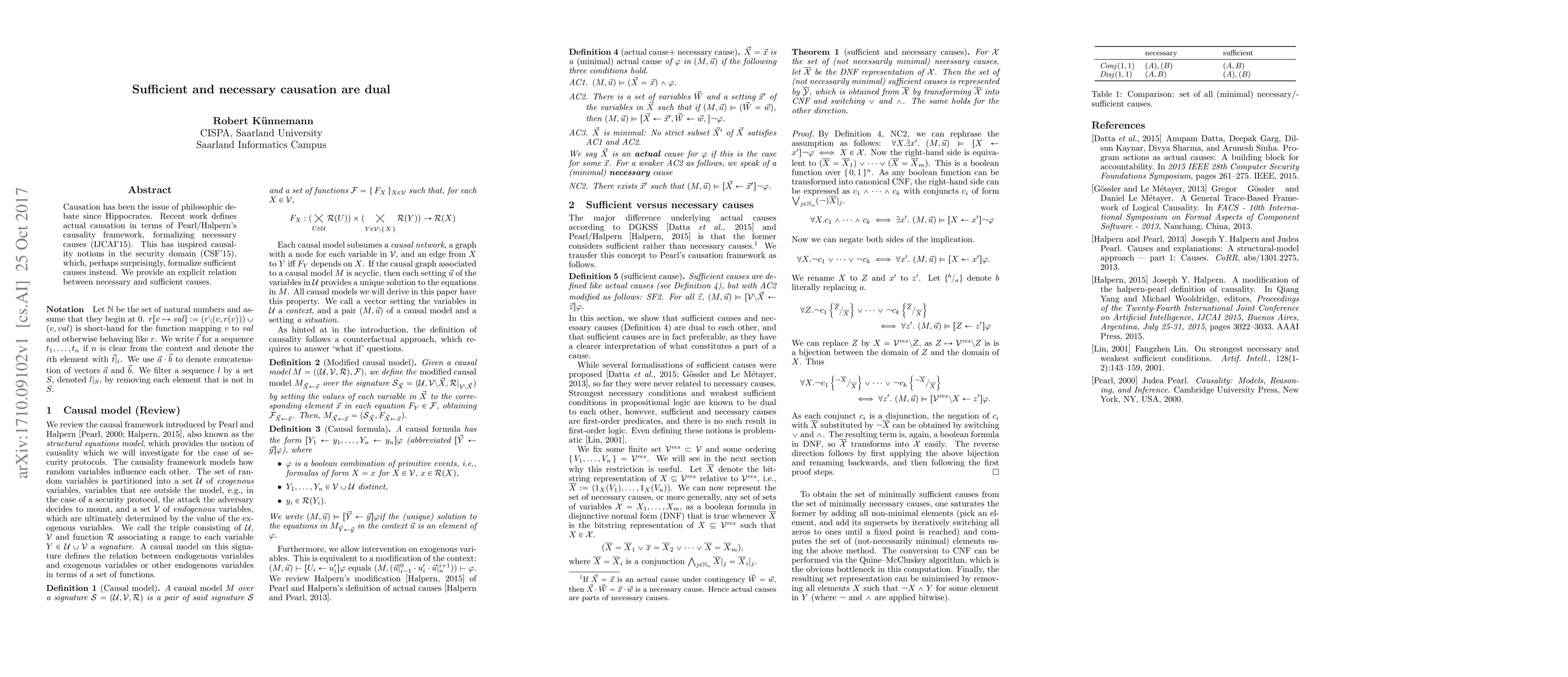 Causation has been the issue of philosophic debate since Hippocrates. Recent work defines actual causation in terms of Pearl/Halpern's causality framework, formalizing necessary causes (IJCAI'15). This has inspired causality notions in the security domain (CSF'15), which, perhaps surprisingly, formalize sufficient causes instead. We provide an explicit relation between necessary and sufficient causes.