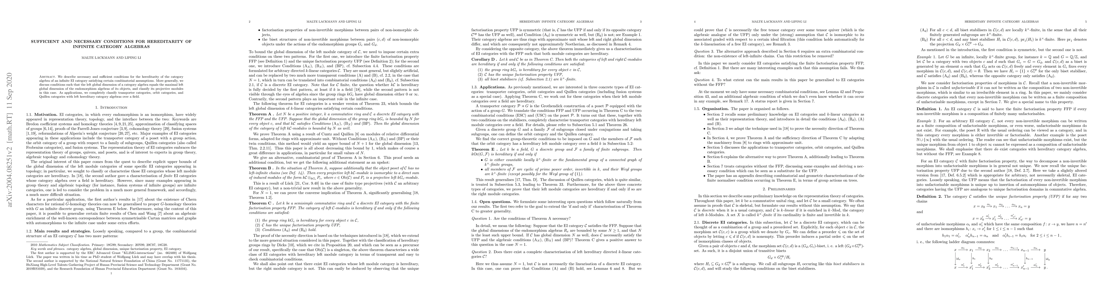 This paper provides necessary and sufficient conditions for the hereditarity of category algebras of infinite EI categories, discusses when the left global dimension matches the maximal left global dimension of endomorphism algebras, and classifies projective modules under these conditions. It applies these findings to classify transporter, orbit, and Quillen categories with left hereditary category algebras over a field.