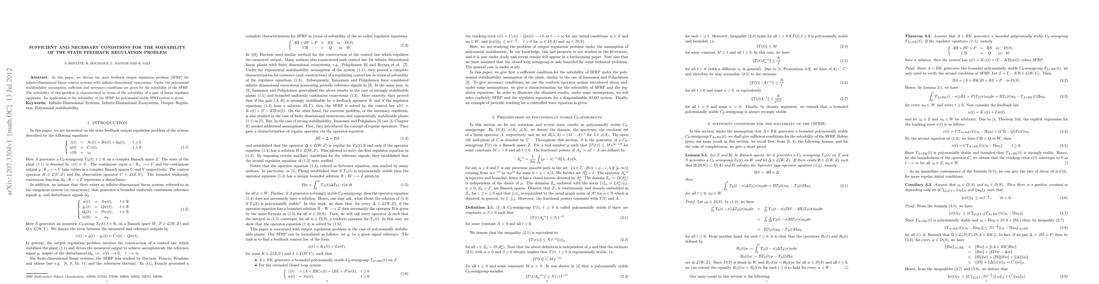 Researchers establish conditions for solving a type of control system problem called state feedback output regulation, which helps stabilize systems with external influences, and provide methods to determine these solutions.