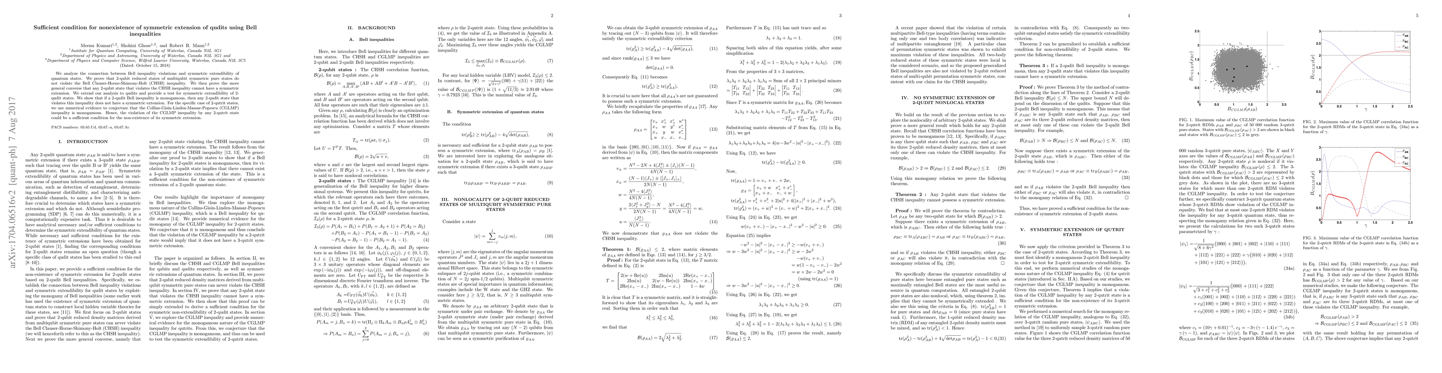 The paper proves that 2-qubit states of symmetric multiqubit pure states don't violate the CHSH Bell inequality. It extends this to qudits, showing that any 2-qubit state violating CHSH lacks symmetric extension. For 2-qudit states, it introduces a test for symmetric extendibility, conjecturing that 2-qutrit state violation of the CGLMP inequality signifies absence of symmetric extension.