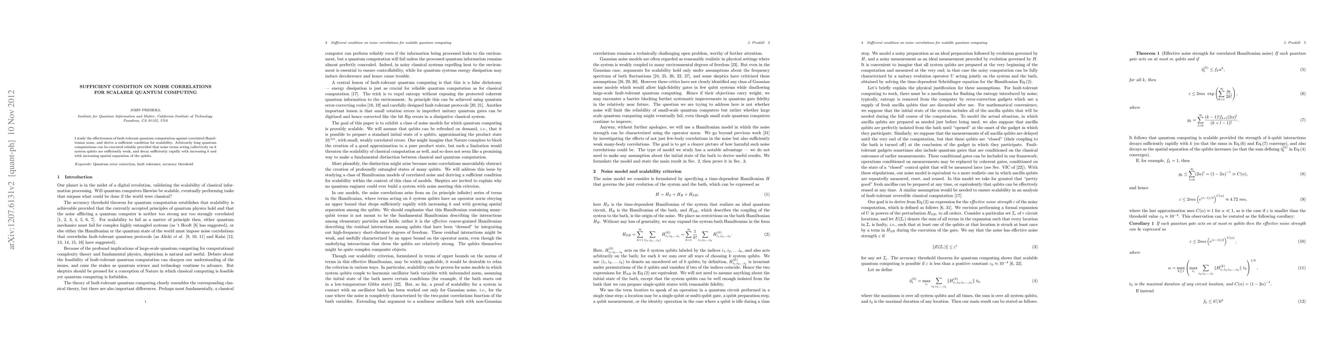 I study the effectiveness of fault-tolerant quantum computation against correlated Hamiltonian noise, and derive a sufficient condition for scalability. Arbitrarily long quantum computations can be executed reliably provided that noise terms acting collectively on k system qubits are sufficiently weak, and decay sufficiently rapidly with increasing k and with increasing spatial separation of the qubits.