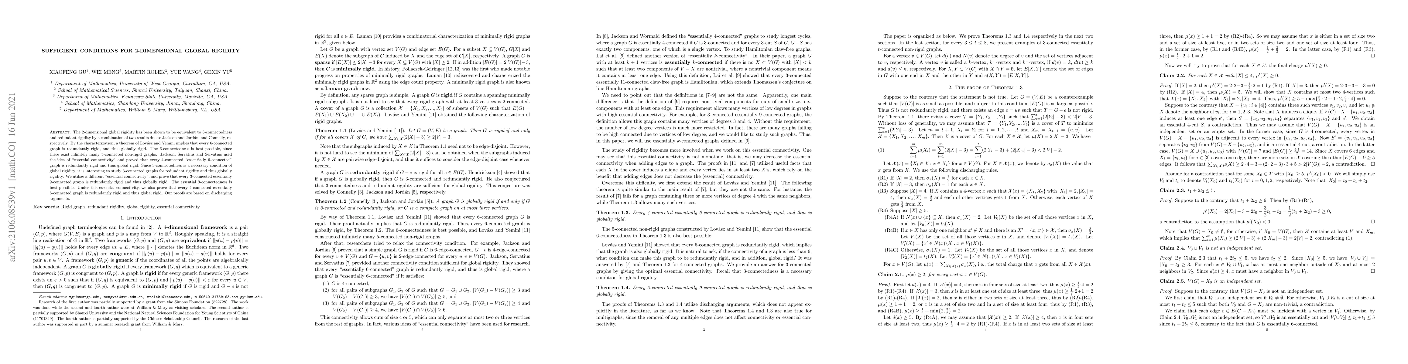 The paper explores sufficient conditions for 2-dimensional global rigidity in graphs, showing that 3-connected essentially 9-connected graphs are globally rigid, with 9-connectedness being optimal. Additionally, it proves that 4-connected essentially 6-connected graphs are also globally rigid, establishing the optimality of 6-connectedness under this framework.