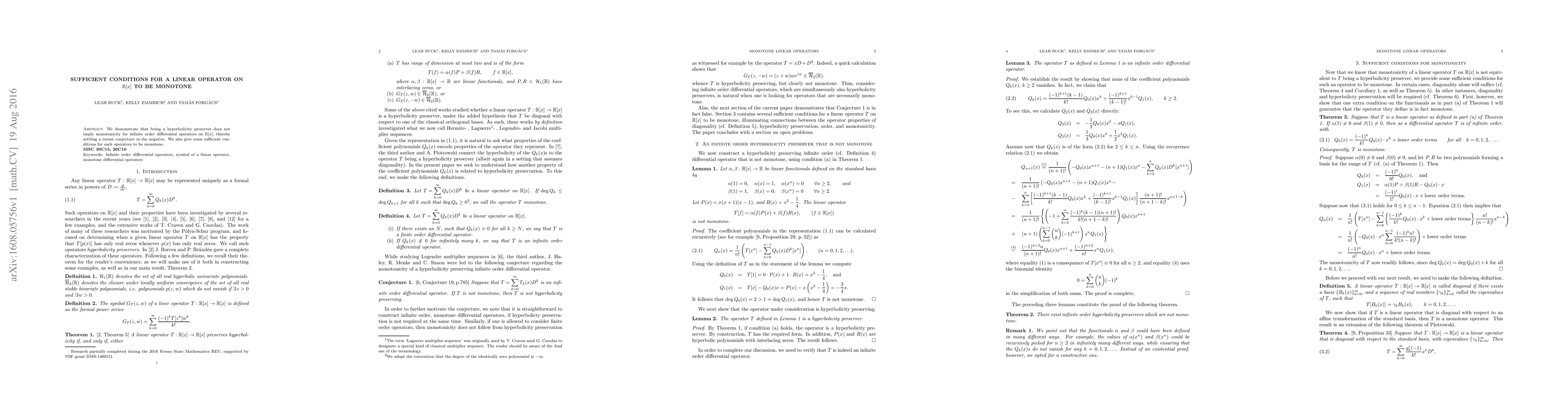 This paper refutes the conjecture that hyperbolicity preservation implies monotonicity for infinite order differential operators on $\mathbb{R}[x]$. It provides sufficient conditions for these operators to be monotone.