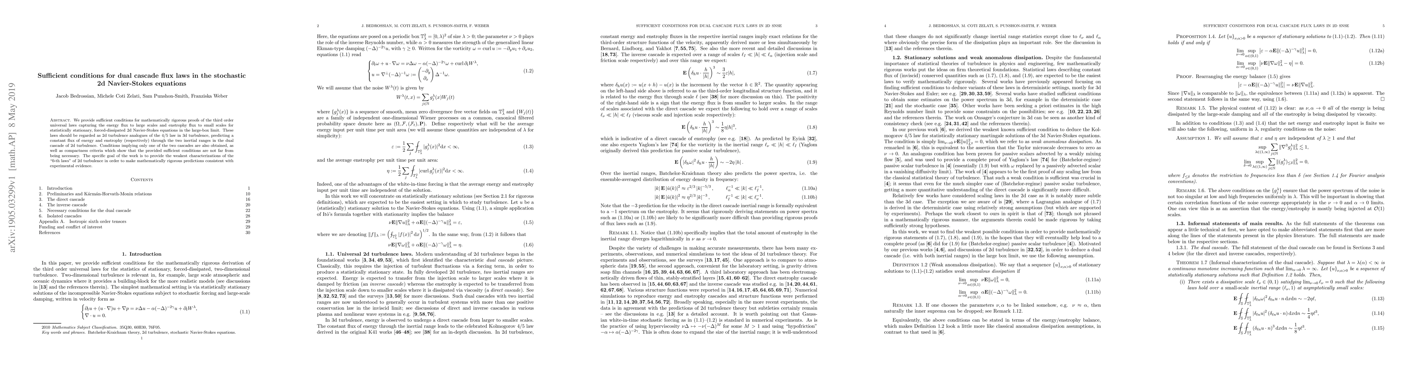 This paper establishes sufficient conditions for dual cascade flux laws in the stochastic 2D Navier-Stokes equations, providing rigorous mathematical proofs for energy and enstrophy fluxes in the large-box limit. It aims to characterize the '0-th laws' of 2D turbulence, offering the weakest conditions consistent with experimental evidence.