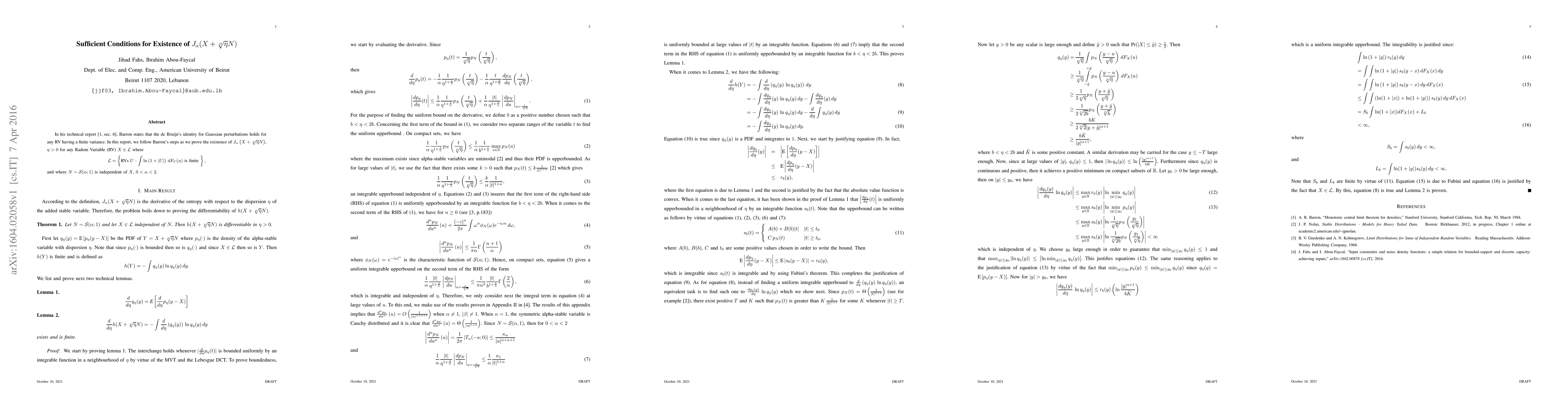 In his technical report~\cite[sec. 6]{barrontech}, Barron states that the de Bruijn's identity for Gaussian perturbations holds for any RV having a finite variance. In this report, we follow Barron's steps as we prove the existence of $J_{\alpha}\left(X + \sqrt[\alpha]{\eta}N\right)$, $\eta > 0$ for any Radom Variable (RV) $X \in \mathcal{L}$ where \begin{equation*} \mathcal{L} = \left\{ \text{RVs} \,\,U: \int \ln\left(1 + |U|\right)\,dF_{U}(u) \text{ is finite } \right\}, \end{equation*} and where $N \sim \mathcal{S}(\alpha;1)$ is independent of $X$, $0< \alpha <2$.