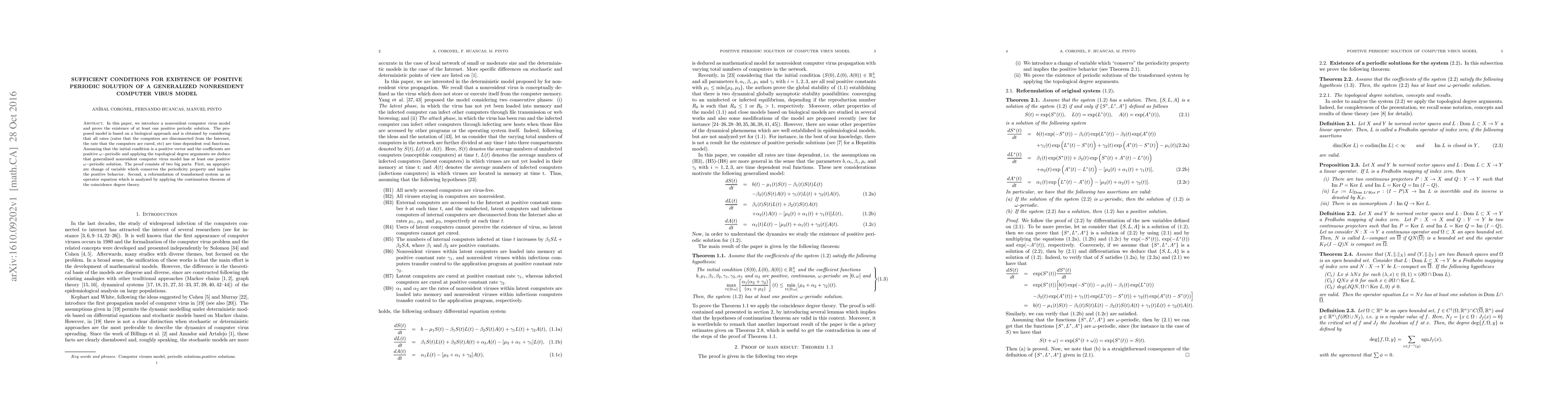A new computer virus model is introduced and proven to have at least one positive periodic solution, assuming certain conditions on initial conditions and system coefficients.