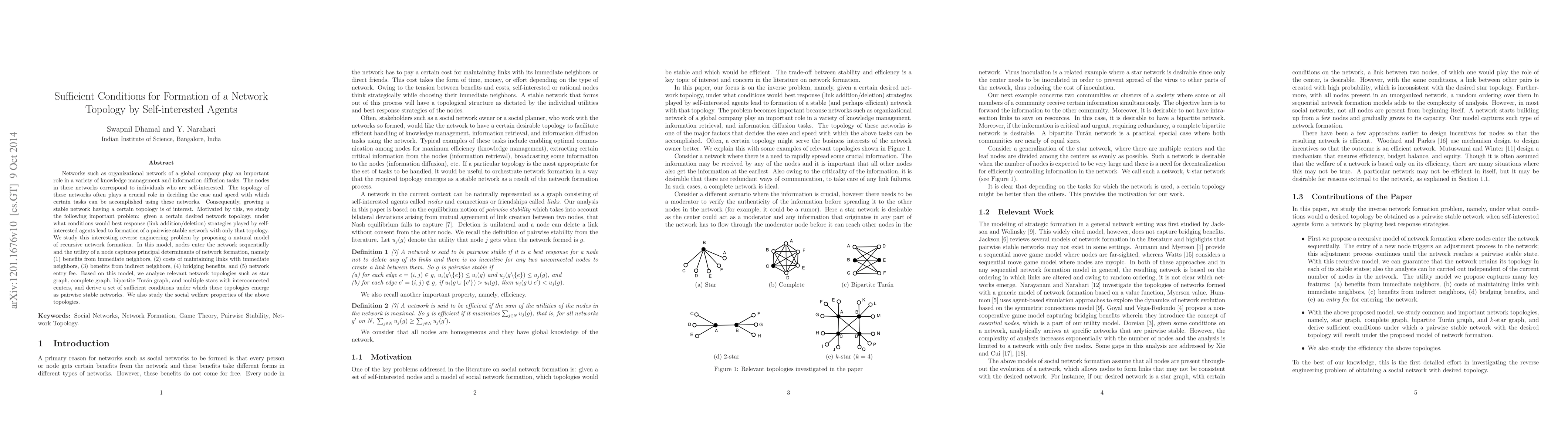This paper investigates the conditions under which self-interested agents can form a network with a desired topology through best response strategies. It proposes a model where nodes sequentially join the network, considering benefits and costs associated with connections, and derives sufficient conditions for the emergence of specific network topologies like star graphs and complete graphs.