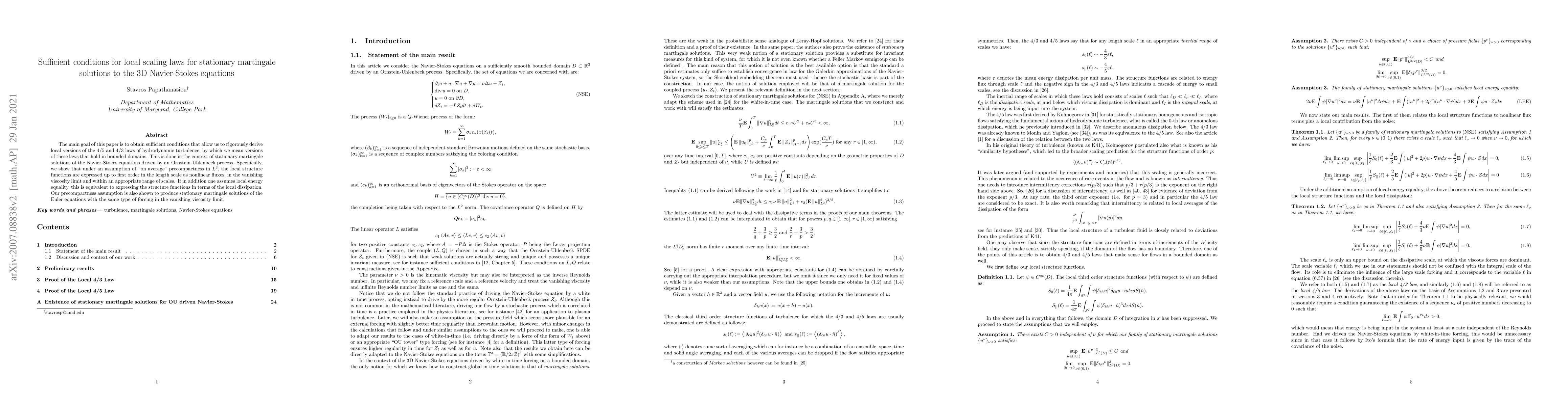 The main goal of this paper is to obtain sufficient conditions that allow us to rigorously derive local versions of the 4/5 and 4/3 laws of hydrodynamic turbulence, by which we mean versions of these laws that hold in bounded domains. This is done in the context of stationary martingale solutions of the Navier-Stokes equations driven by an Ornstein-Uhlenbeck process. Specifically, we show that under an assumption of \say{on average} precompactness in $L^3,$ the local structure functions are expressed up to first order in the length scale as nonlinear fluxes, in the vanishing viscosity limit and within an appropriate range of scales. If in addition one assumes local energy equality, this is equivalent to expressing the structure functions in terms of the local dissipation. Our precompactness assumption is also shown to produce stationary martingale solutions of the Euler equations with the same type of forcing in the vanishing viscosity limit.