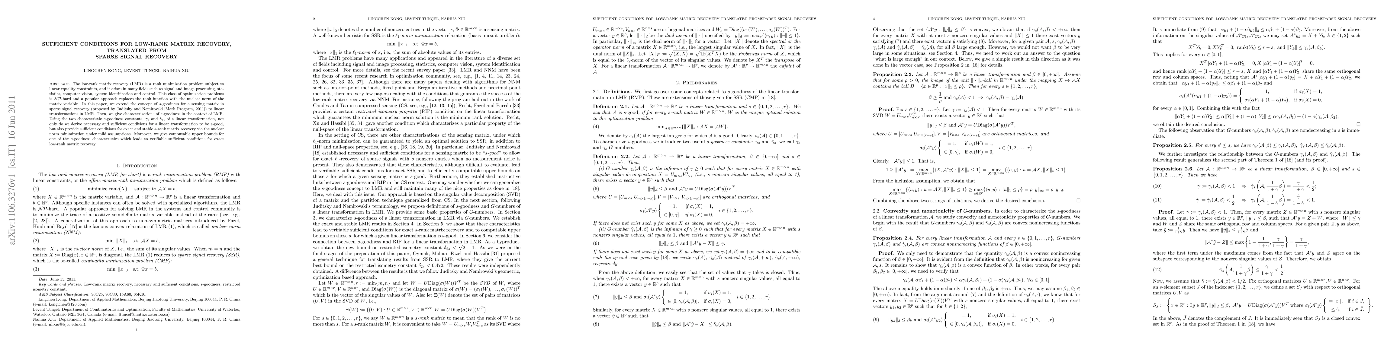 The low-rank matrix recovery (LMR) is a rank minimization problem subject to linear equality constraints, and it arises in many fields such as signal and image processing, statistics, computer vision, system identification and control. This class of optimization problems is $\N\P$-hard and a popular approach replaces the rank function with the nuclear norm of the matrix variable. In this paper, we extend the concept of $s$-goodness for a sensing matrix in sparse signal recovery (proposed by Juditsky and Nemirovski [Math Program, 2011]) to linear transformations in LMR. Then, we give characterizations of $s$-goodness in the context of LMR. Using the two characteristic $s$-goodness constants, ${\gamma}_s$ and $\hat{\gamma}_s$, of a linear transformation, not only do we derive necessary and sufficient conditions for a linear transformation to be $s$-good, but also provide sufficient conditions for exact and stable $s$-rank matrix recovery via the nuclear norm minimization under mild assumptions. Moreover, we give computable upper bounds for one of the $s$-goodness characteristics which leads to verifiable sufficient conditions for exact low-rank matrix recovery.