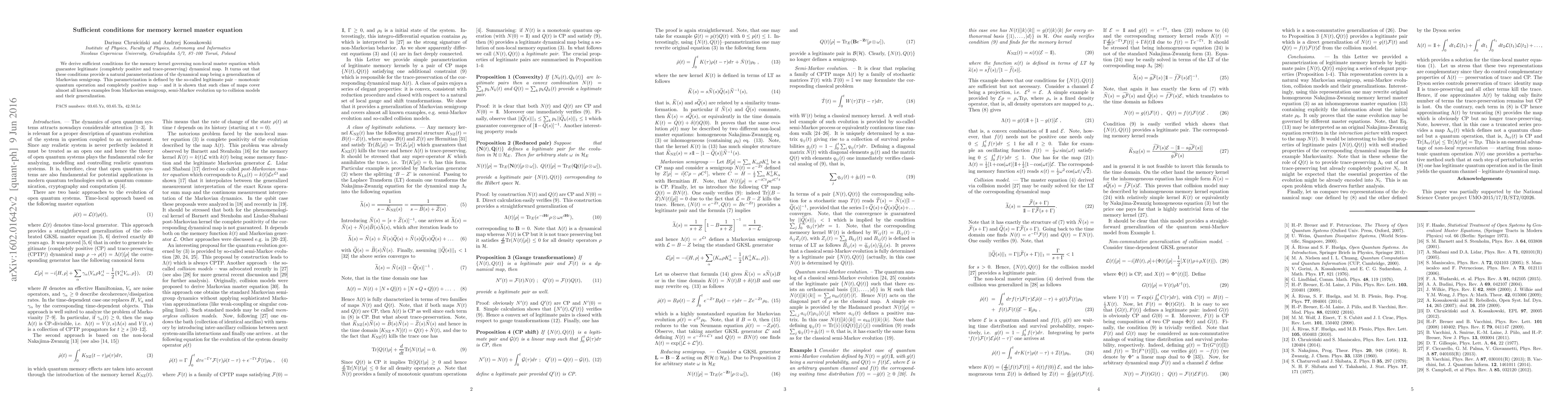 We derive sufficient conditions for the memory kernel which guarantee legitimate (completely positive and trace-preserving) dynamical map. It turns out that these conditions provide a natural parameterizations of the dynamical map being a generalization of Markovian semigroup. It is shown that this class of maps cover almost all known examples -- from Markovian semigroup, semi-Markov evolution up to collision models and their generalization.