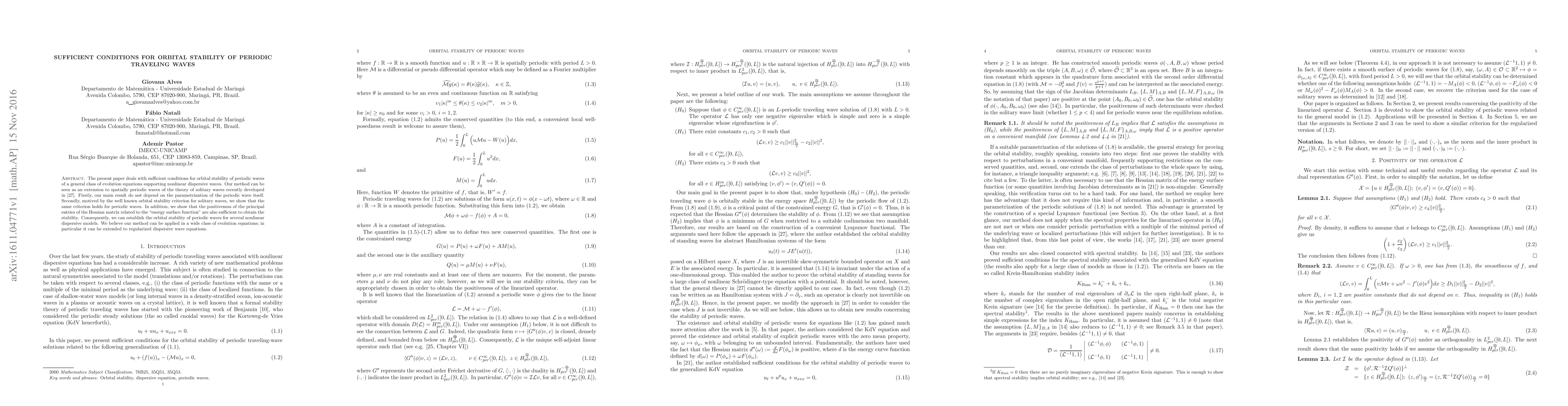 This paper establishes sufficient conditions for the orbital stability of periodic traveling waves in a class of nonlinear dispersive evolution equations. It extends the solitary wave stability theory and shows that the positiveness of principal Hessian entries ensures stability, applicable to various nonlinear dispersive models.