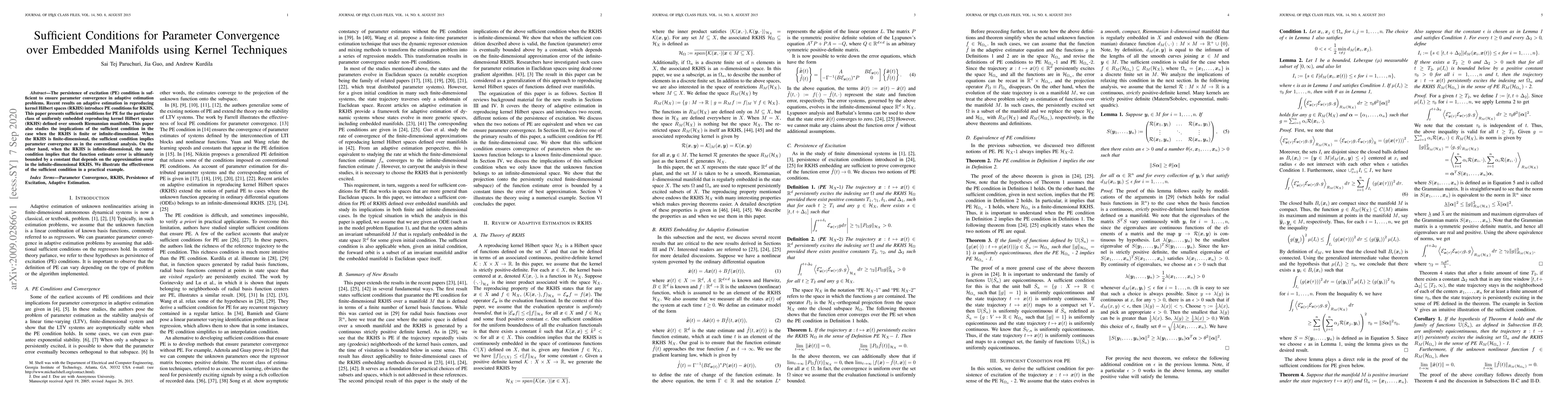 This paper establishes sufficient conditions for parameter convergence in adaptive estimation problems over embedded manifolds using kernel techniques, with implications for finite- and infinite-dimensional reproducing kernel Hilbert spaces.