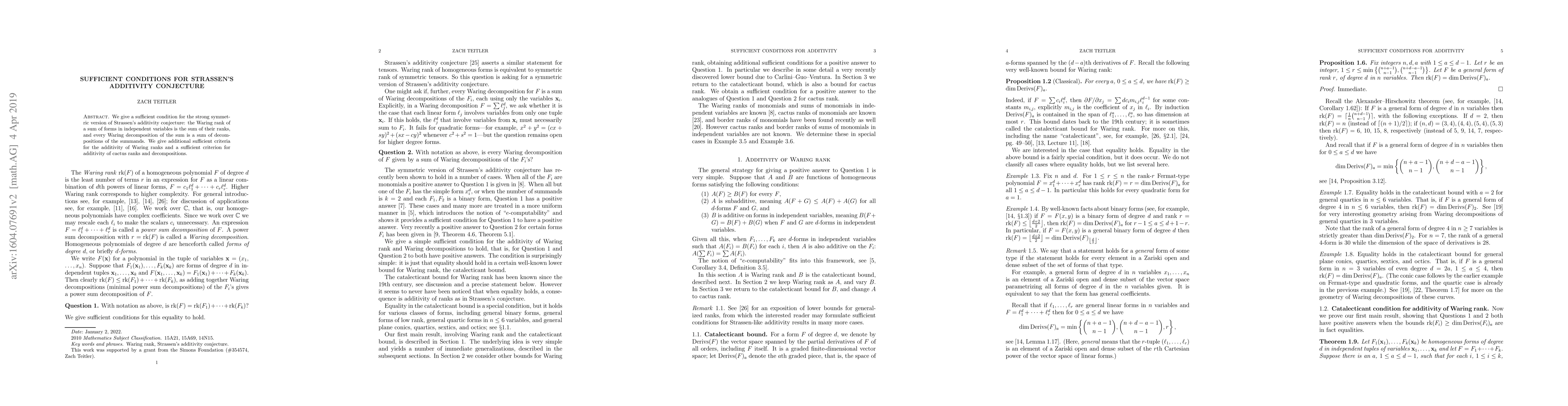 We give a sufficient condition for the strong symmetric version of Strassen's additivity conjecture: the Waring rank of a sum of forms in independent variables is the sum of their ranks, and every Waring decomposition of the sum is a sum of decompositions of the summands. We give additional sufficient criteria for the additivity of Waring ranks and a sufficient criterion for additivity of cactus ranks and decompositions.