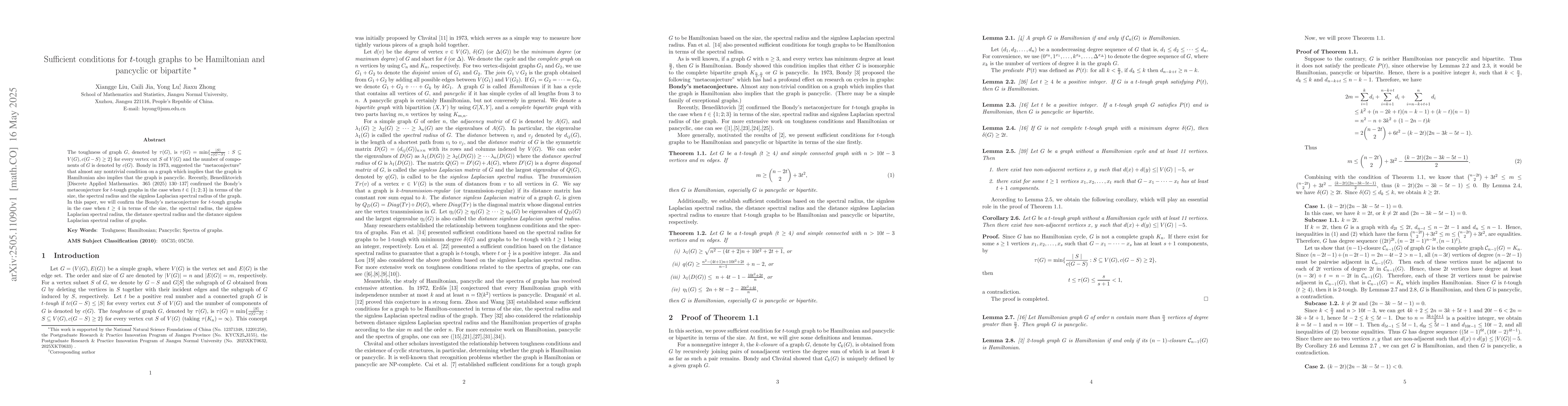 The paper presents sufficient conditions for t-tough graphs (t≥4) to be Hamiltonian and pancyclic or bipartite, using various spectral radii and distance spectral radii as key graph properties.