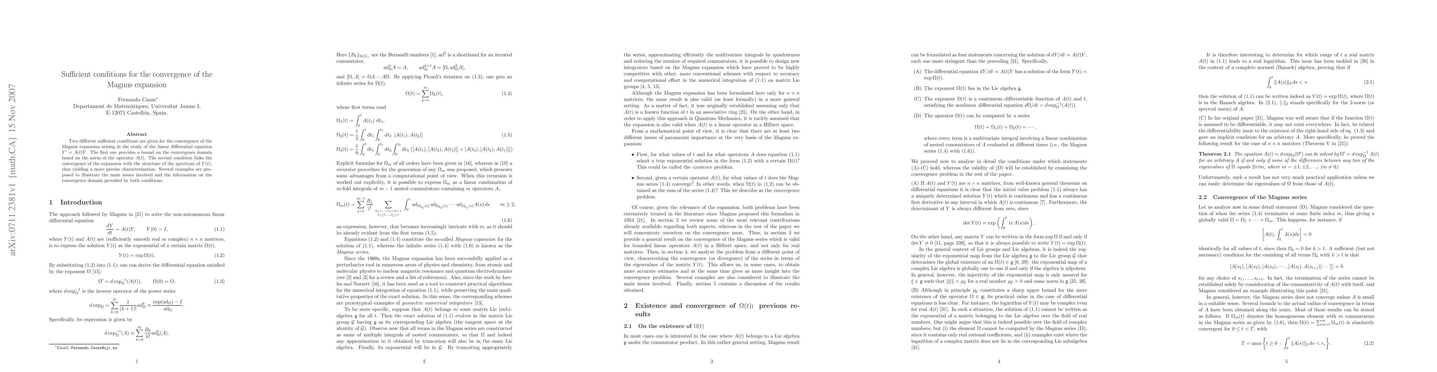 This paper provides two sufficient conditions for the convergence of the Magnus expansion in solving linear differential equations. The first condition bounds the convergence domain based on the norm of the operator, while the second links convergence to the spectrum structure of the solution, offering a more precise characterization. Examples are used to illustrate these conditions and their implications.