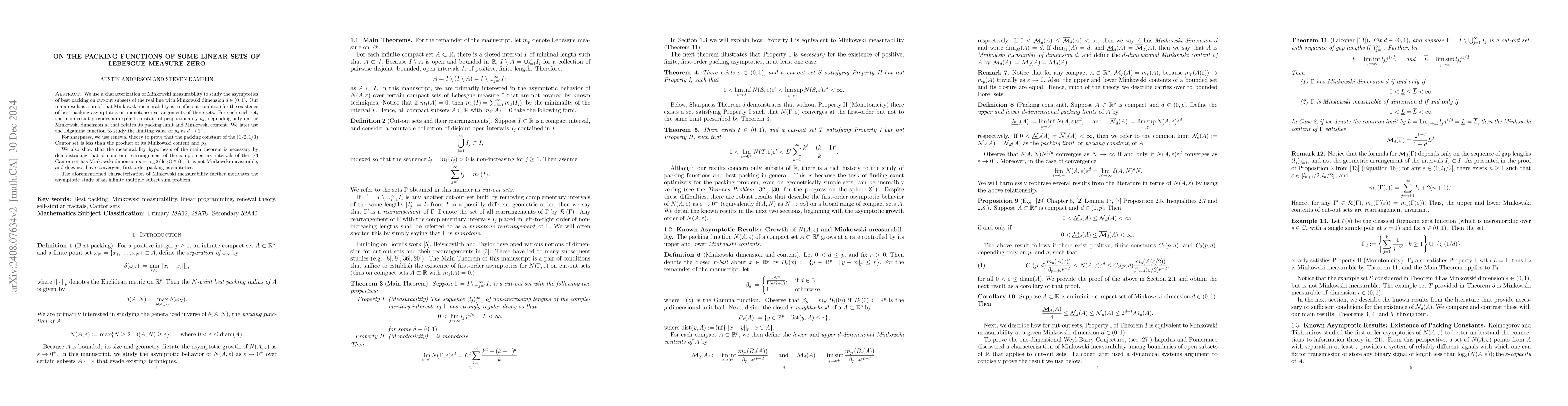 We use a characterization of Minkowski measurability to study the asymptotics of best packing on cut-out subsets of the real line with Minkowski dimension $d\in(0,1)$. Our main result is a proof that Minkowski measurability is a sufficient condition for the existence of best packing asymptotics on monotone rearrangements of these sets. For each such set, the main result provides an explicit constant of proportionality $p_d,$ depending only on the Minkowski dimension $d,$ that relates its packing limit and Minkowski content. We later use the Digamma function to study the limiting value of $p_d$ as $d\to 1^-.$ For sharpness, we use renewal theory to prove that the packing constant of the $(1/2,1/3)$ Cantor set is less than the product of its Minkowski content and $p_d$. We also show that the measurability hypothesis of the main theorem is necessary by demonstrating that a monotone rearrangement of the complementary intervals of the 1/3 Cantor set has Minkowski dimension $d=\log2/\log3\in(0,1),$ is not Minkowski measurable, and does not have convergent first-order packing asymptotics. The aforementioned characterization of Minkowski measurability further motivates the asymptotic study of an infinite multiple subset sum problem.