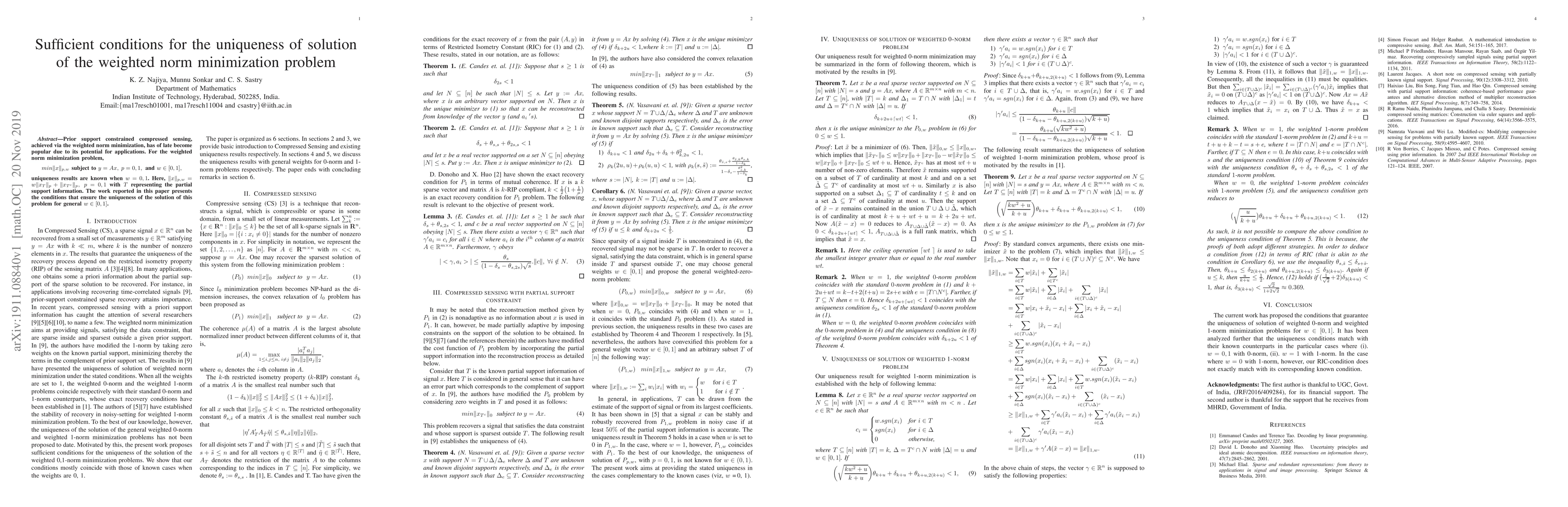 This paper establishes sufficient conditions for the uniqueness of solutions in the weighted norm minimization problem for compressed sensing, extending beyond the special cases where $w=0$ or $1$. The problem is formulated as minimizing $\|x\|_{p,w}$ subject to $y=Ax$, with $w \in [0,1]$ determining the weight between the supported and unsupported parts of the solution.