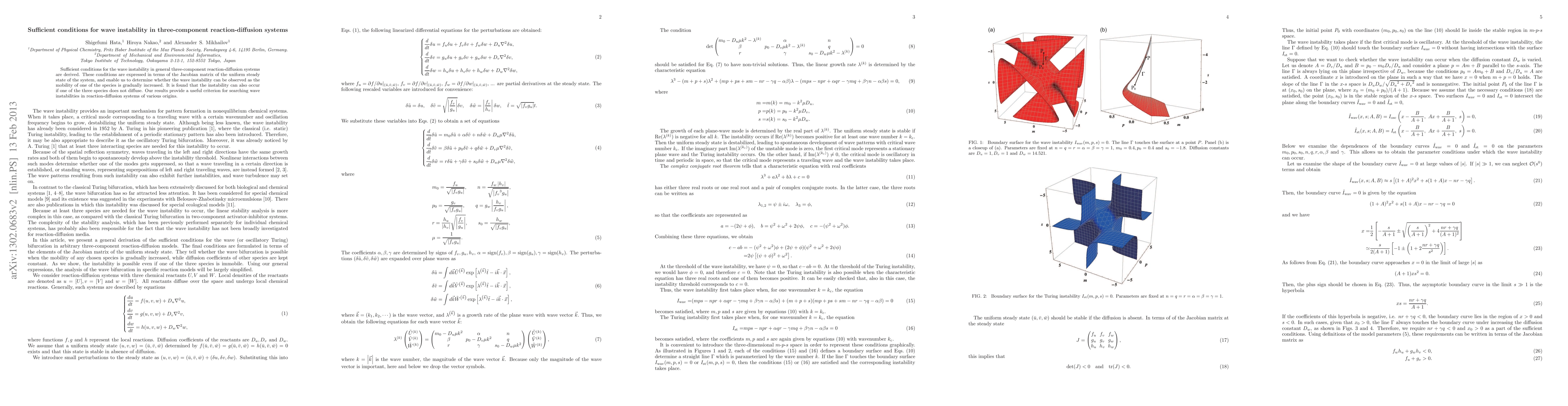 This paper derives sufficient conditions for wave instability in three-component reaction-diffusion systems, expressed via the Jacobian matrix of the uniform steady state. It reveals that instability can occur even if one species does not diffuse, providing a useful criterion for identifying wave instabilities in diverse systems.
