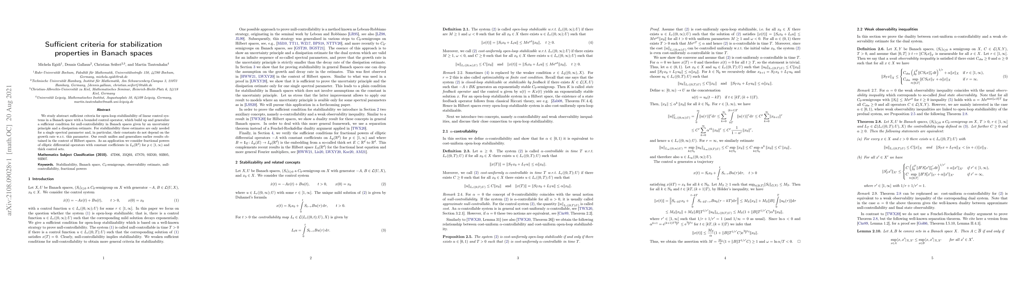 This paper develops a general sufficient criterion for stabilizability in Banach spaces, unifying earlier results in Hilbert spaces and providing new insights into control systems with fractional powers of elliptic operators.