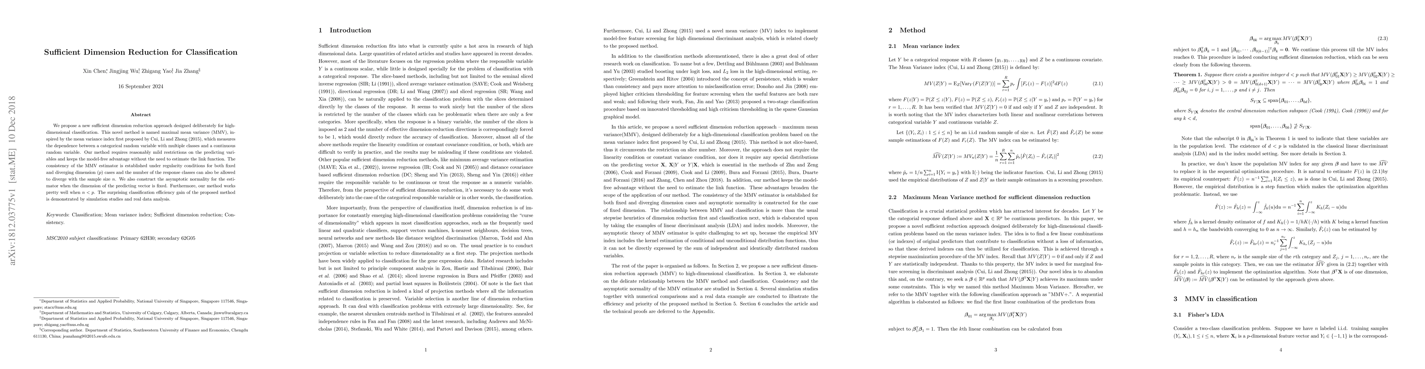 This paper introduces a new sufficient dimension reduction method called maximal mean variance (MMV) for high-dimensional classification. The MMV method maintains model-free advantages and demonstrates consistent and asymptotically normal estimation under various conditions, showing effective classification efficiency even when the number of predictors exceeds the sample size.