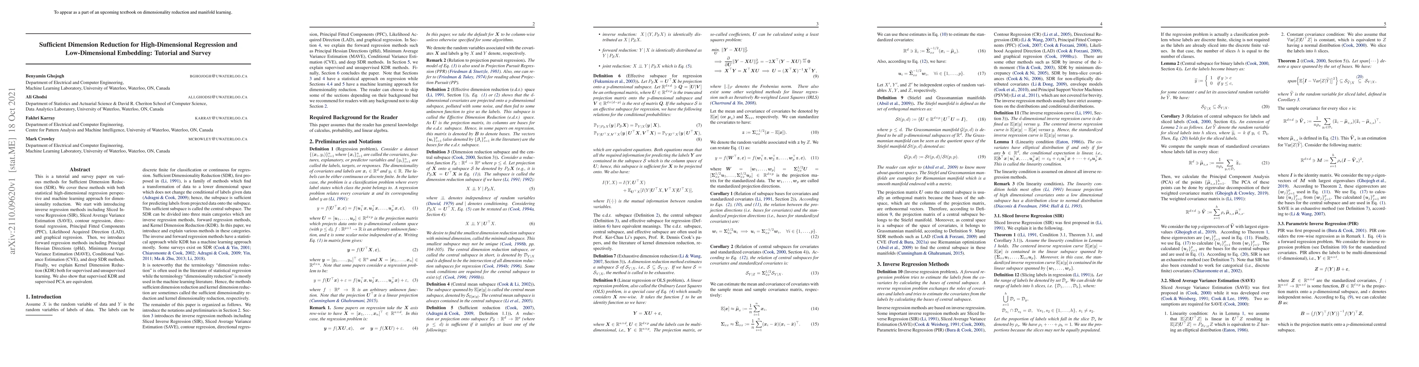 This paper provides a comprehensive tutorial and survey on Sufficient Dimension Reduction (SDR) methods, covering both statistical and machine learning perspectives. It discusses various inverse and forward regression techniques, as well as deep SDR and Kernel Dimension Reduction (KDR) methods, highlighting their applications in high-dimensional regression and dimensionality reduction.