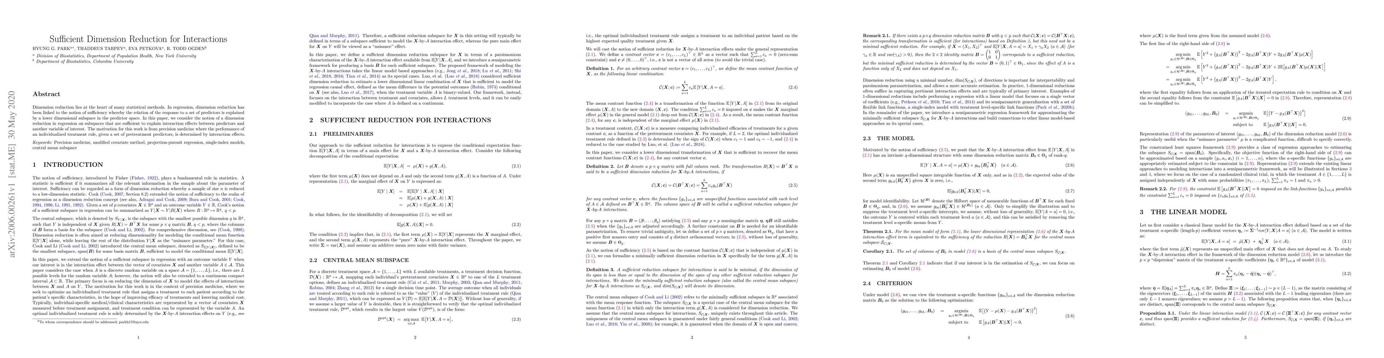 Dimension reduction lies at the heart of many statistical methods. In regression, dimension reduction has been linked to the notion of sufficiency whereby the relation of the response to a set of predictors is explained by a lower dimensional subspace in the predictor space. In this paper, we consider the notion of a dimension reduction in regression on subspaces that are sufficient to explain interaction effects between predictors and another variable of interest. The motivation for this work is from precision medicine where the performance of an individualized treatment rule, given a set of pretreatment predictors, is determined by interaction effects.