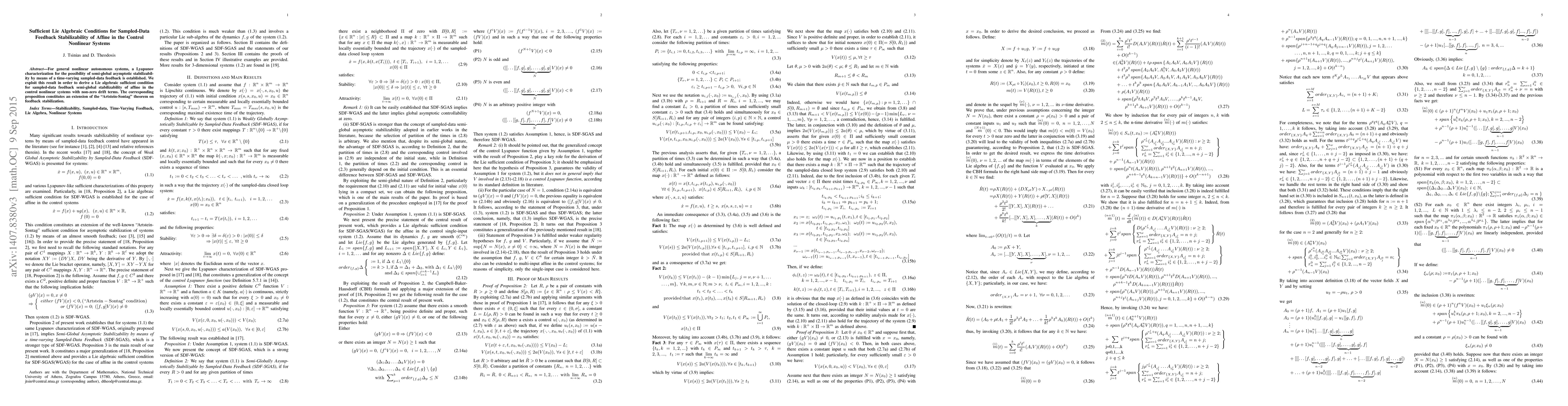 For general nonlinear autonomous systems, a Lyapunov characterization for the possibility of semi-global asymptotic stabilizability by means of a time-varying sampled-data feedback is established. We exploit this result in order to derive a Lie algebraic sufficient condition for sampled-data feedback semi-global stabilizability of affine in the control nonlinear systems with non-zero drift terms. The corresponding proposition constitutes an extension of the "Artstein-Sontag" theorem on feedback stabilization.