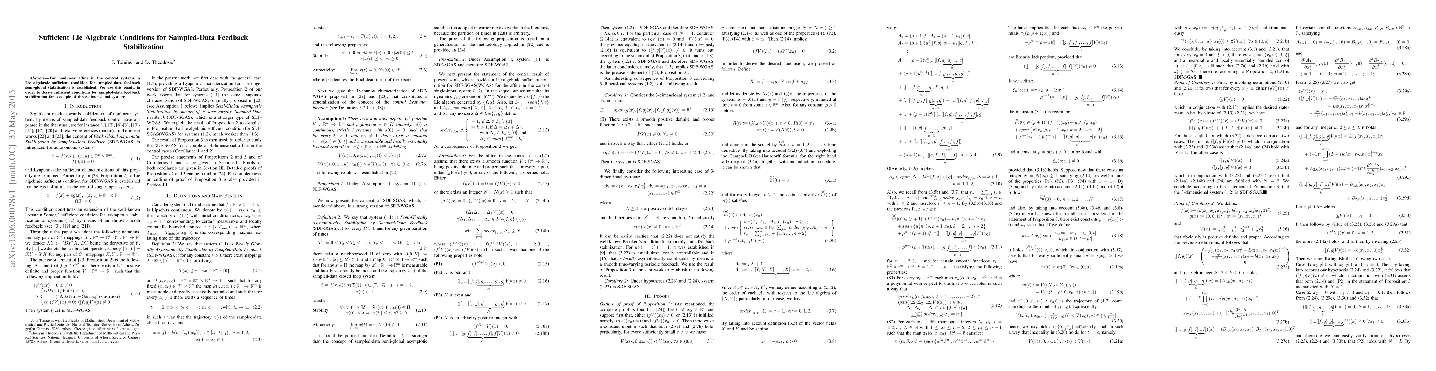 For nonlinear affine in the control systems, a Lie algebraic sufficient condition for sampled-data feedback semi-global stabilization is established. We use this result, in order to derive sufficient conditions for sampled-data feedback stabilization for a couple of three-dimensional systems.
