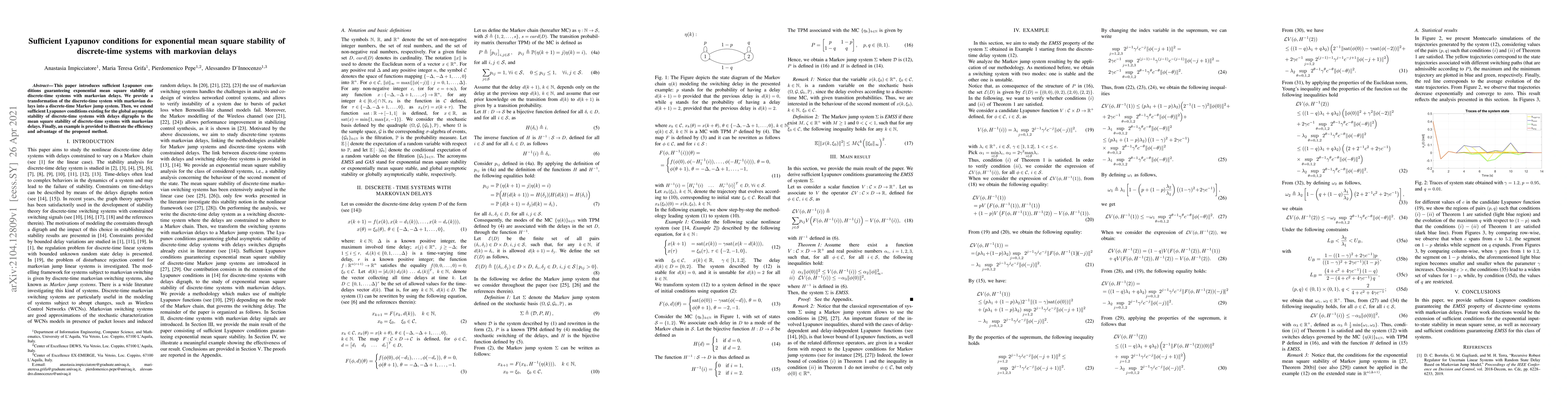 This paper presents sufficient Lyapunov conditions for exponential mean square stability of discrete-time systems with Markovian delays, transforming them into Markov jump systems and extending existing stability conditions. An example demonstrates the effectiveness of the proposed approach.