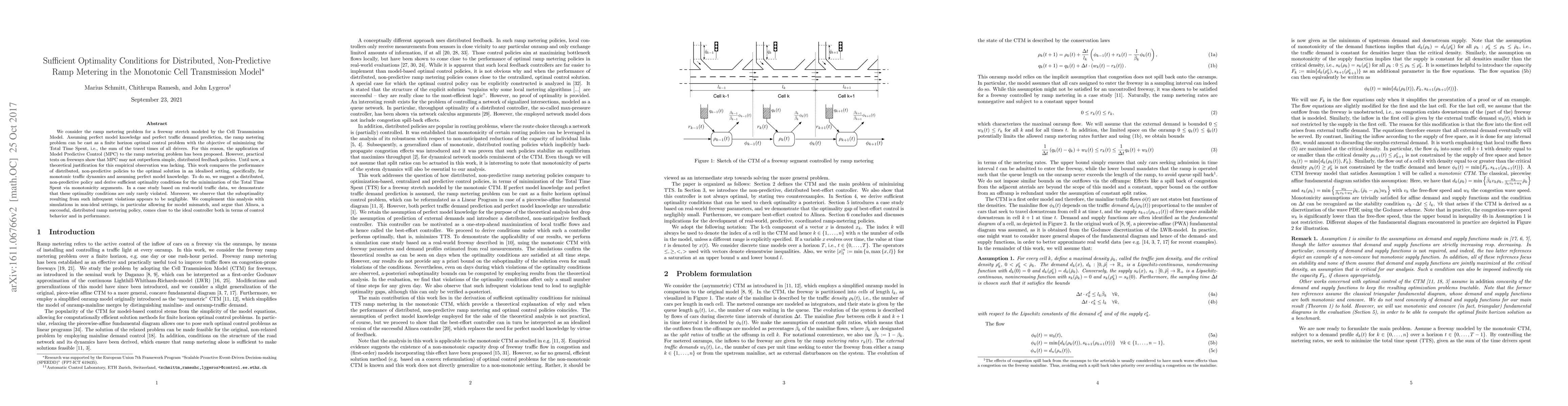 This paper investigates the optimality of distributed, non-predictive ramp metering policies in the Cell Transmission Model, demonstrating that these policies can achieve near-optimal performance despite not using predictive control. It shows that sufficient optimality conditions derived via monotonicity arguments are rarely violated in real-world traffic scenarios.