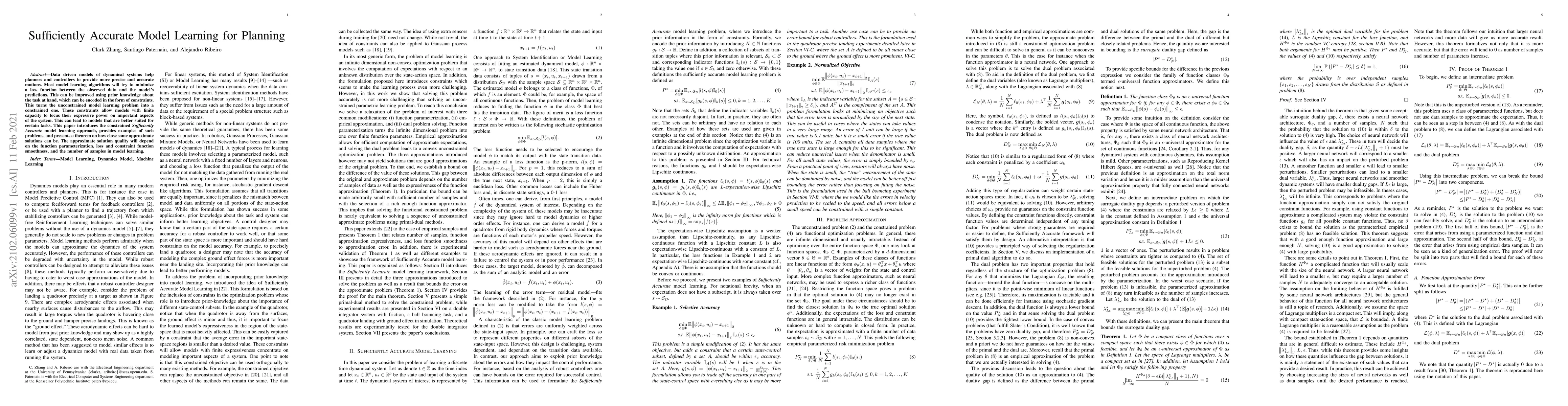 Data driven models of dynamical systems help planners and controllers to provide more precise and accurate motions. Most model learning algorithms will try to minimize a loss function between the observed data and the model's predictions. This can be improved using prior knowledge about the task at hand, which can be encoded in the form of constraints. This turns the unconstrained model learning problem into a constrained one. These constraints allow models with finite capacity to focus their expressive power on important aspects of the system. This can lead to models that are better suited for certain tasks. This paper introduces the constrained Sufficiently Accurate model learning approach, provides examples of such problems, and presents a theorem on how close some approximate solutions can be. The approximate solution quality will depend on the function parameterization, loss and constraint function smoothness, and the number of samples in model learning.