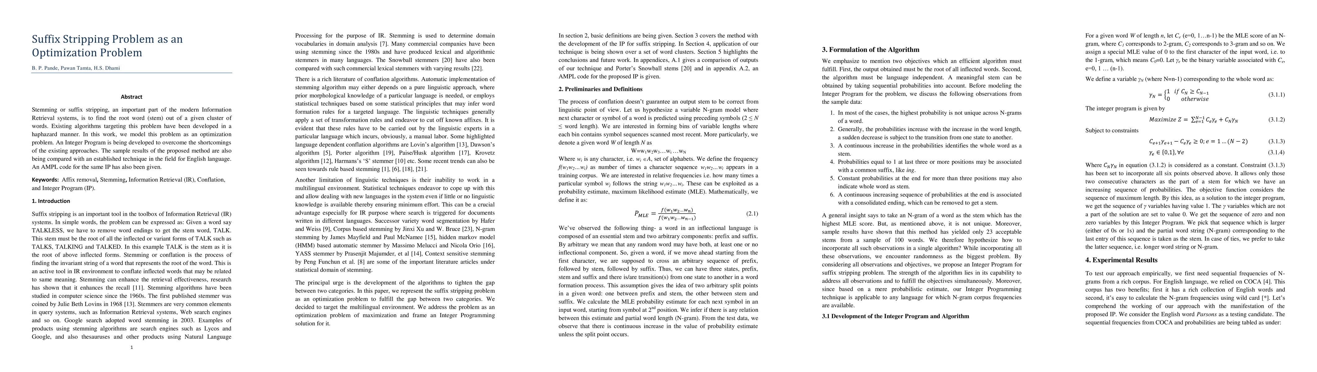 A new optimization approach models stemming as an Integer Program to improve efficiency and accuracy in root word extraction from clusters of words. The proposed method outperforms existing techniques with a comparable AMPL code.