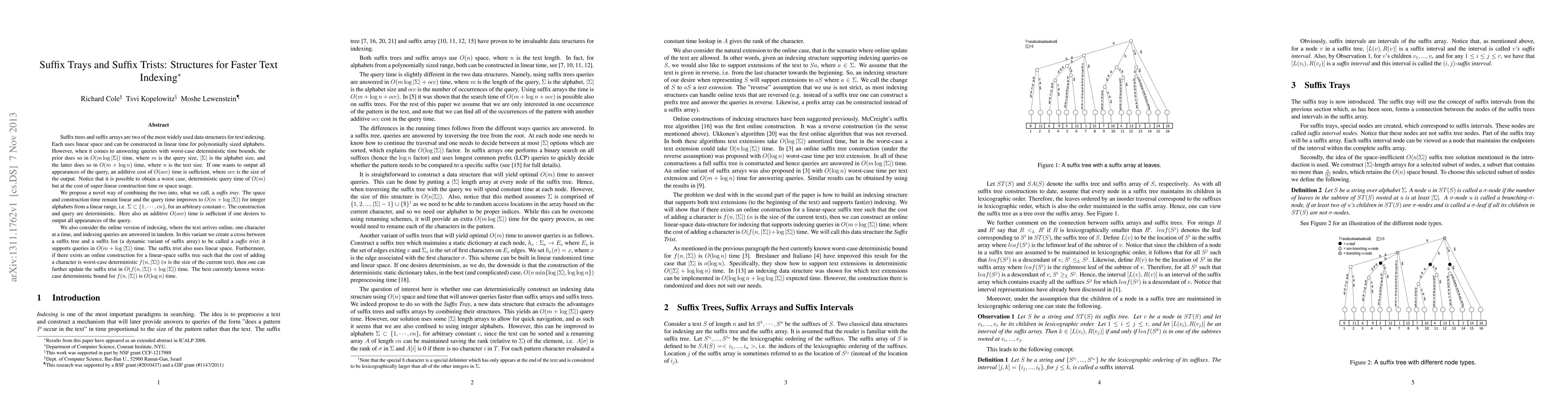 This paper proposes a new data structure called a suffix tray that combines suffix trees and suffix arrays to achieve faster text indexing with linear space and construction time, while improving query time to $O(m+\log|\Sigma|)$ for integer alphabets. The paper also introduces a suffix trist for online text indexing, which combines suffix trees and suffix lists to maintain linear space and query time of $O(m+\log|\Sigma|)$.