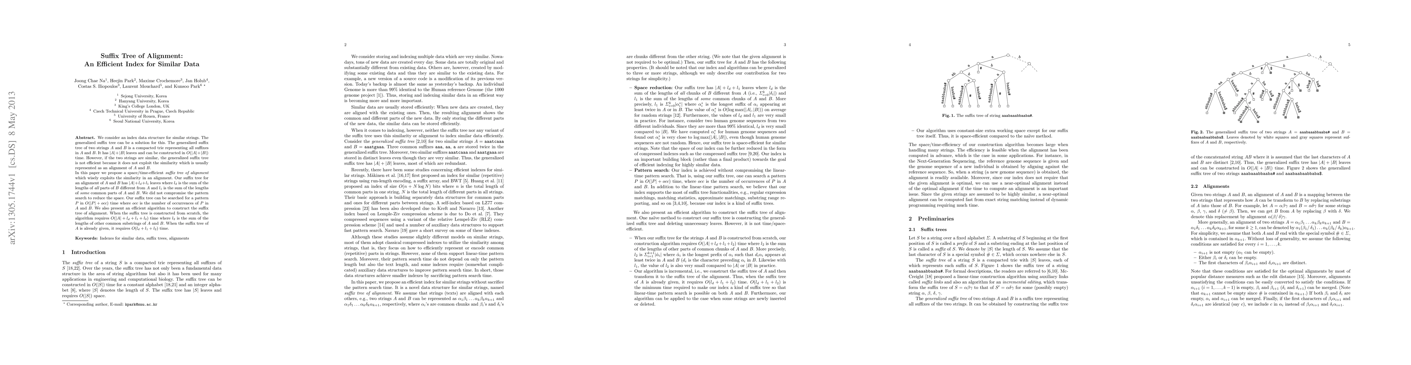 This paper proposes a space/time-efficient suffix tree of alignment for similar strings, exploiting their alignment to reduce the number of leaves. The proposed suffix tree maintains efficient pattern search while requiring $O(|A| + l_d + l_1 + l_2)$ time for construction, where $l_d$, $l_1$, and $l_2$ represent differences and common parts of the strings.