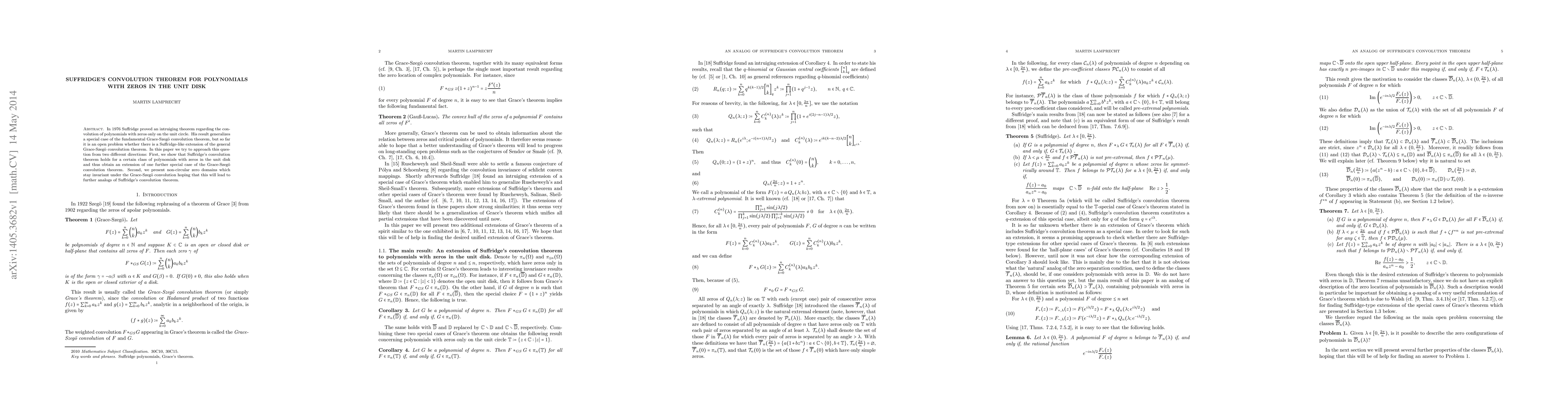 In 1976 Suffridge proved an intruiging theorem regarding the convolution of polynomials with zeros only on the unit circle. His result generalizes a special case of the fundamental Grace-Szeg\"o convolution theorem, but so far it is an open problem whether there is a Suffridge-like extension of the general Grace-Szeg\"o convolution theorem. In this paper we try to approach this question from two different directions: First, we show that Suffridge's convolution theorem holds for a certain class of polynomials with zeros in the unit disk and thus obtain an extension of one further special case of the Grace-Szeg\"o convolution theorem. Second, we present non-circular zero domains which stay invariant under the Grace-Szeg\"o convolution hoping that this will lead to further analogs of Suffridge's convolution theorem.