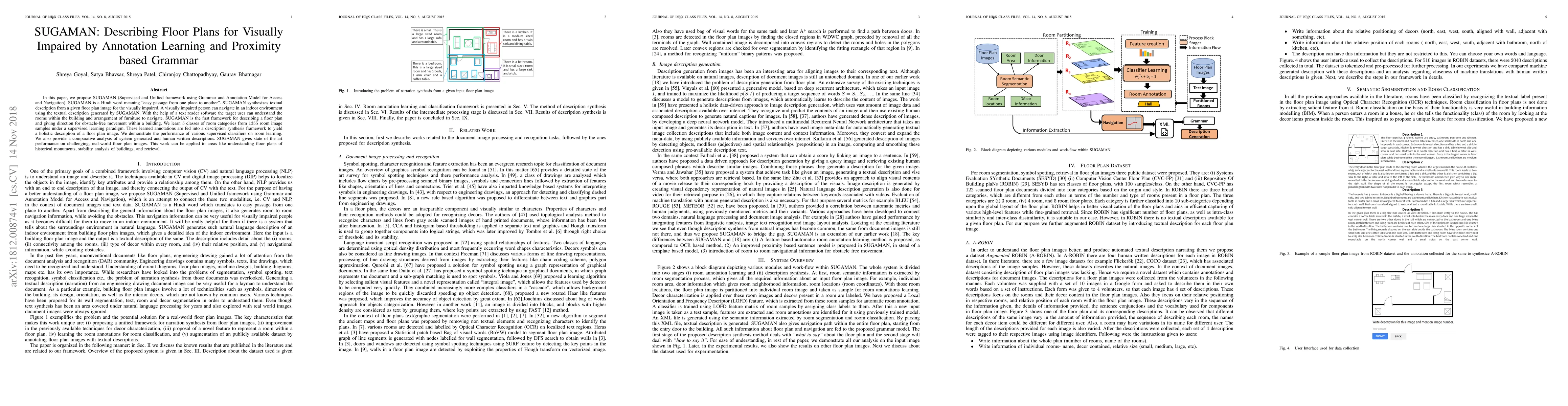 SUGAMAN is a framework that generates textual descriptions from floor plan images to aid visually impaired individuals in navigating indoor environments. It employs supervised learning to classify room types and synthesizes descriptions for obstacle-free navigation, demonstrating state-of-the-art performance.