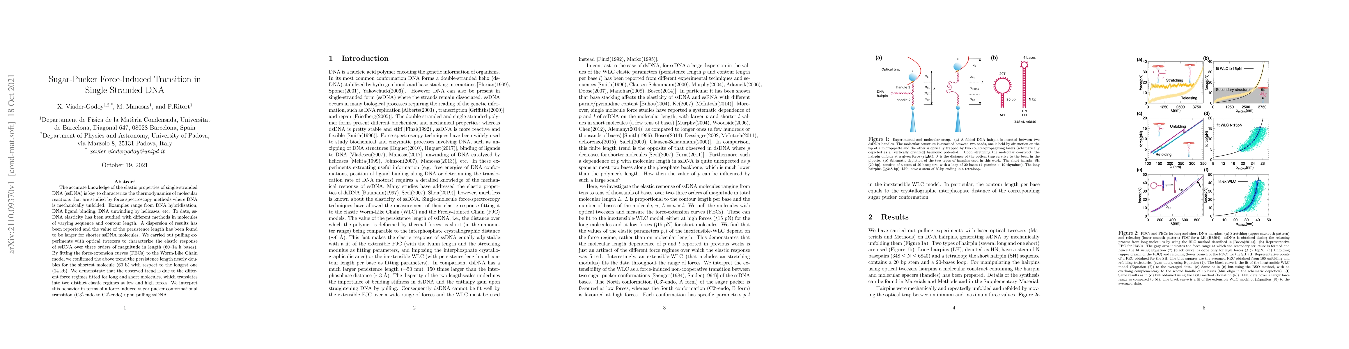 This paper investigates the elastic properties of single-stranded DNA (ssDNA) using optical tweezers, revealing that the persistence length doubles for shorter ssDNA molecules. The observed trend is attributed to a force-induced sugar pucker transition from C3'-endo to C2'-endo conformations, leading to two distinct elastic regimes at low and high forces.
