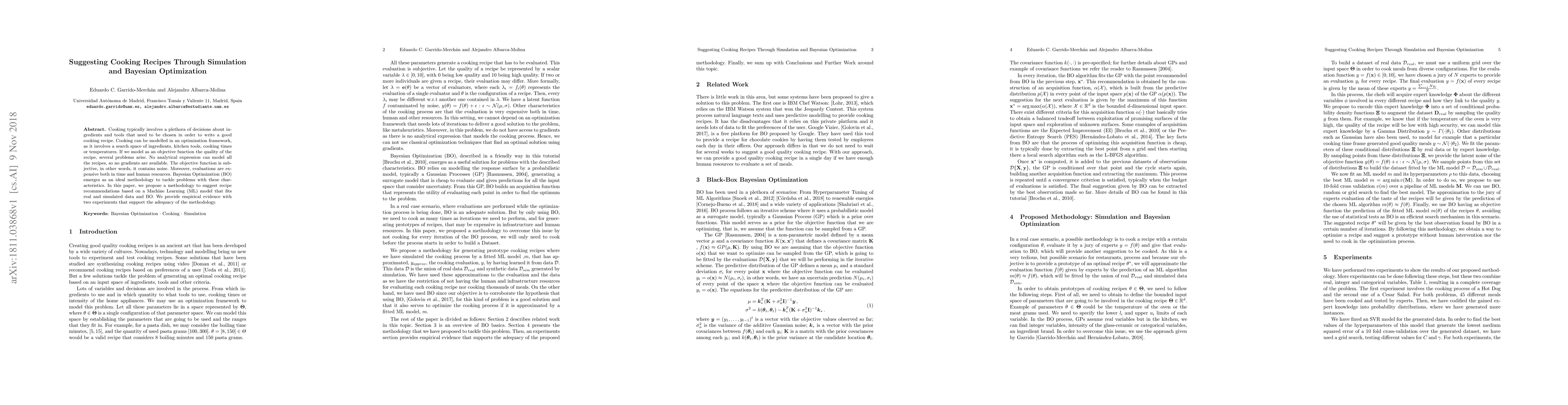 Cooking typically involves a plethora of decisions about ingredients and tools that need to be chosen in order to write a good cooking recipe. Cooking can be modelled in an optimization framework, as it involves a search space of ingredients, kitchen tools, cooking times or temperatures. If we model as an objective function the quality of the recipe, several problems arise. No analytical expression can model all the recipes, so no gradients are available. The objective function is subjective, in other words, it contains noise. Moreover, evaluations are expensive both in time and human resources. Bayesian Optimization (BO) emerges as an ideal methodology to tackle problems with these characteristics. In this paper, we propose a methodology to suggest recipe recommendations based on a Machine Learning (ML) model that fits real and simulated data and BO. We provide empirical evidence with two experiments that support the adequacy of the methodology.