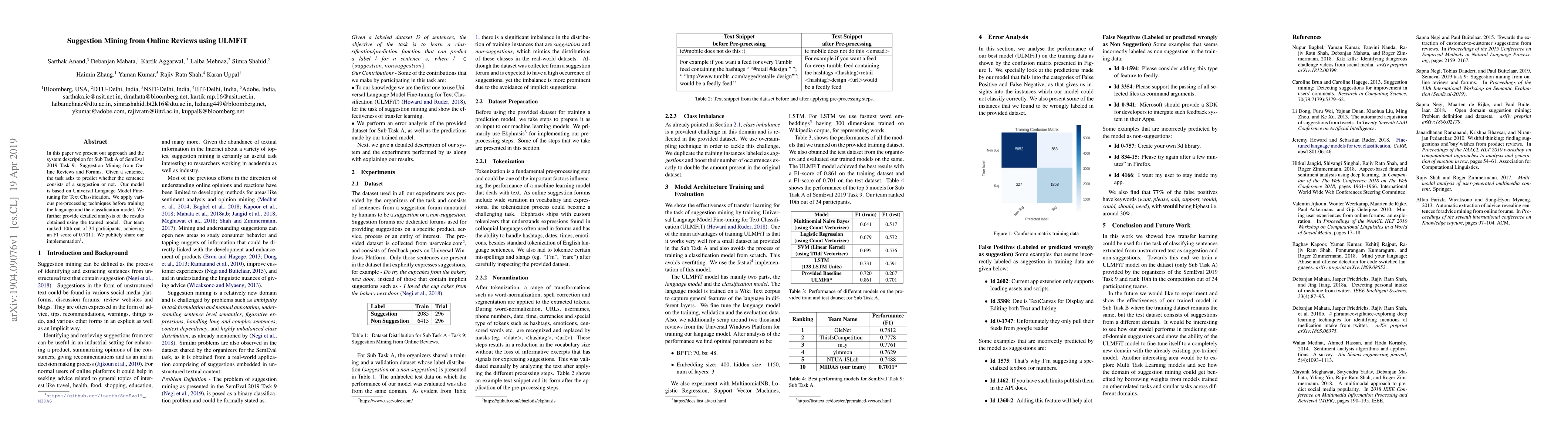 This paper describes a ULMFiT-based model for detecting suggestions in online reviews, achieving an F1 score of 0.7011 and ranking 10th in SemEval 2019 Task 9. The authors share their implementation publicly for further research.