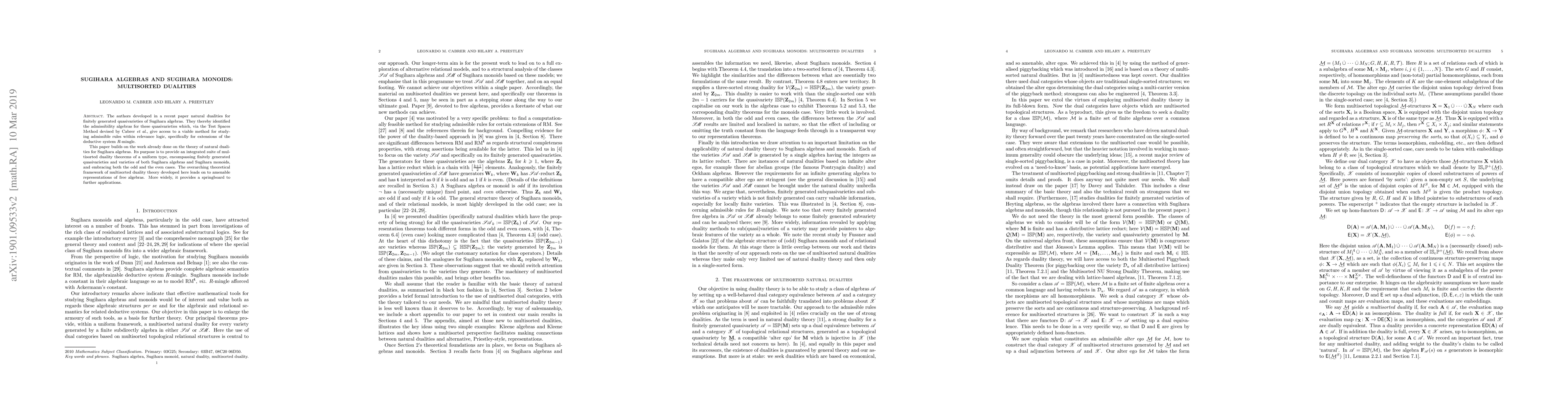 The authors developed in a recent paper natural dualities for finitely generated quasivarieties of Sugihara algebras. They thereby identified the admissibility algebras for these quasivarieties which, via the Test Spaces Method devised by Cabrer et al., give access to a viable method for studying admissible rules within relevance logic, specifically for extensions of the deductive system $R$-mingle. This paper builds on the work already done on the theory of natural dualities for Sugihara algebras. Its purpose is to provide an integrated suite of multisorted duality theorems of a uniform type, encompassing finitely generated quasivarieties and varieties of both Sugihara algebras and Sugihara monoids, and embracing both the odd and the even cases. The overarching theoretical framework of multisorted duality theory developed here leads on to amenable representations of free algebras. More widely, it provides a springboard to further applications.