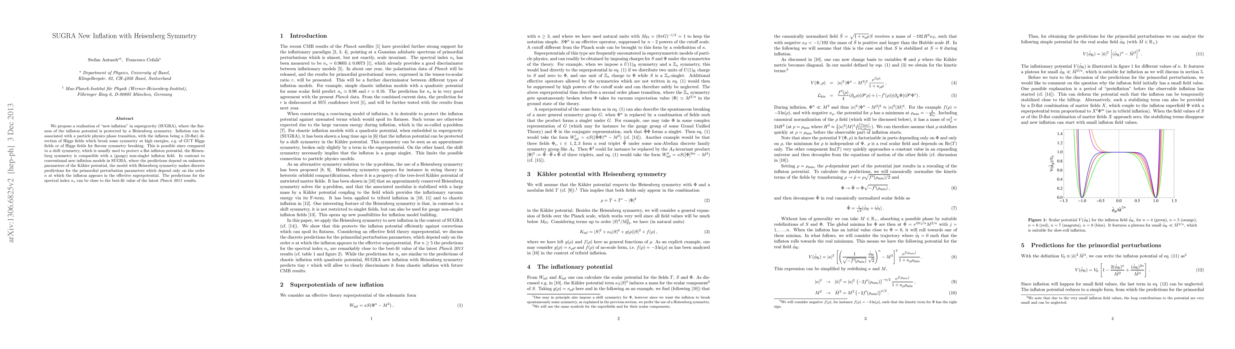 We propose a realisation of 'new inflation' in supergravity (SUGRA), where the flatness of the inflaton potential is protected by a Heisenberg symmetry. Inflation can be associated with a particle physics phase transition, with the inflaton being a (D-flat) direction of Higgs fields which break some symmetry at high energies, e.g. of GUT Higgs fields or of Higgs fields for flavour symmetry breaking. This is possible since compared to a shift symmetry, which is usually used to protect a flat inflaton potential, the Heisenberg symmetry is compatible with a (gauge) non-singlet inflaton field. In contrast to conventional new inflation models in SUGRA, where the predictions depend on unknown parameters of the K"ahler potential, the model with Heisenberg symmetry makes discrete predictions for the primordial perturbation parameters which depend only on the order n at which the inflaton appears in the effective superpotential. The predictions for the spectral index n_s can be close to the best-fit value of the latest Planck 2013 results.