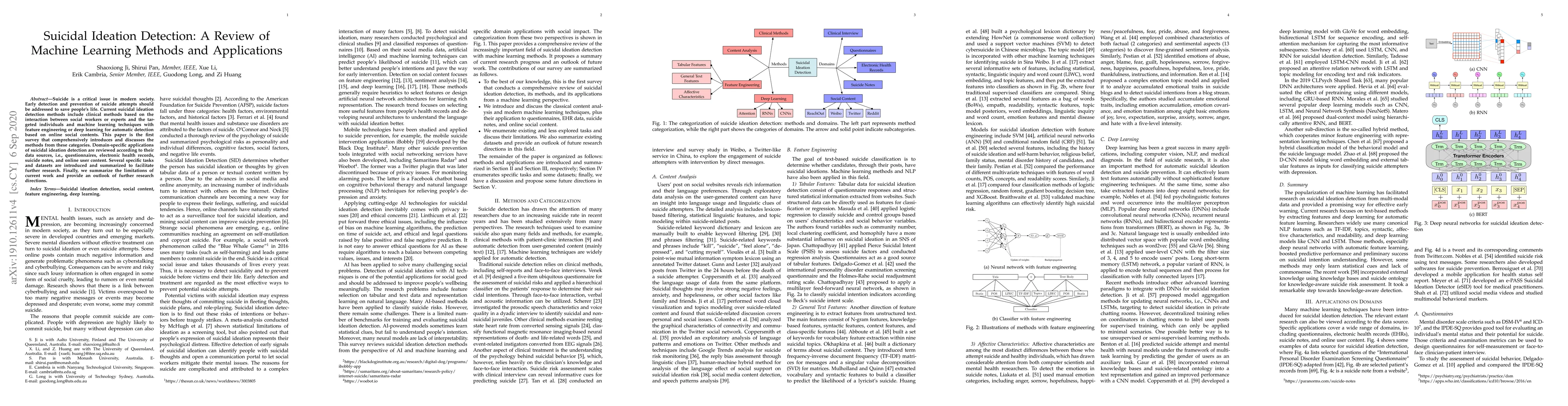 This paper surveys machine learning methods for detecting suicidal ideation, comparing clinical and automated techniques based on social interactions and online content. It reviews domain-specific applications using diverse data sources and highlights limitations and future research directions.