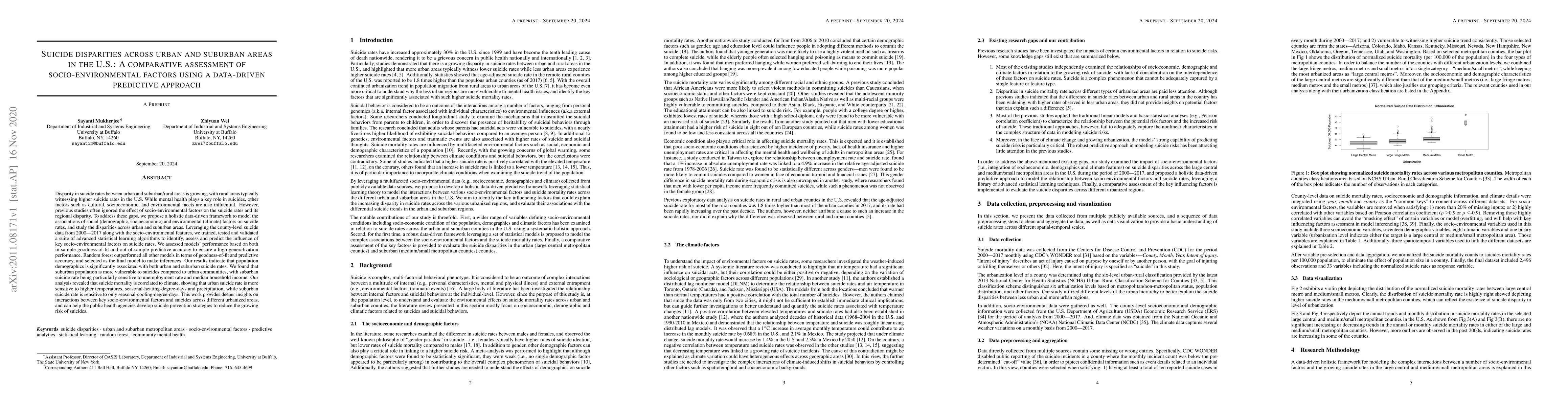 This study employs a data-driven framework to analyze suicide disparities between urban and suburban areas in the U.S., focusing on socio-environmental factors. Random forest models reveal that suburban populations are more vulnerable to suicide, particularly influenced by unemployment and income, while urban suicide rates are more sensitive to climate factors like temperature and precipitation.