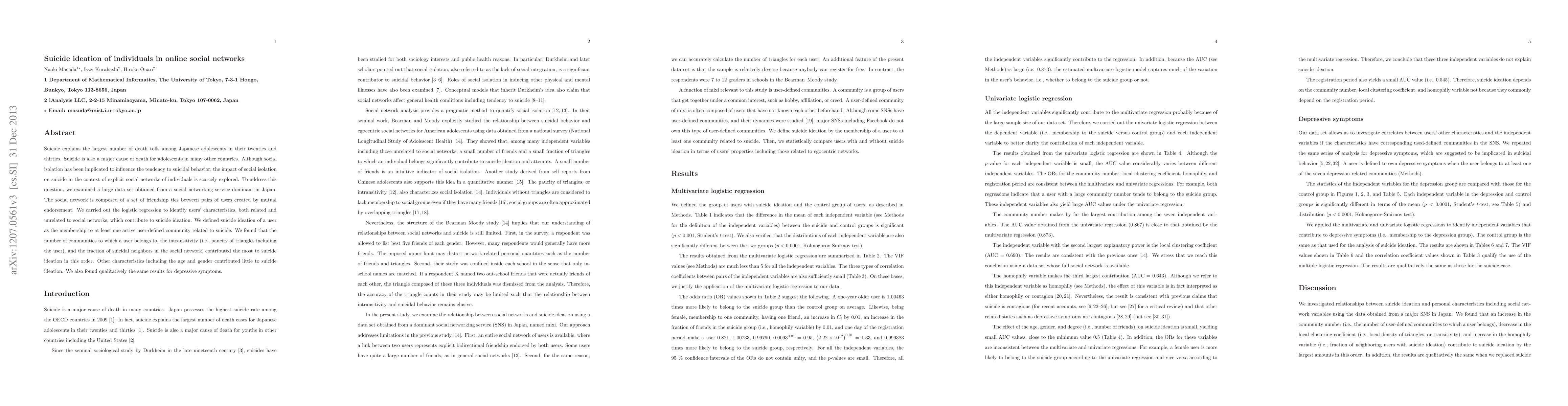 This study investigates the relationship between social network structure and suicide ideation among Japanese adolescents using a large dataset from a dominant social networking service. Key findings include that the number of communities a user belongs to, network intransitivity, and the fraction of suicidal neighbors most strongly predict suicide ideation, while age and gender contribute less. Similar results were found for depressive symptoms.
