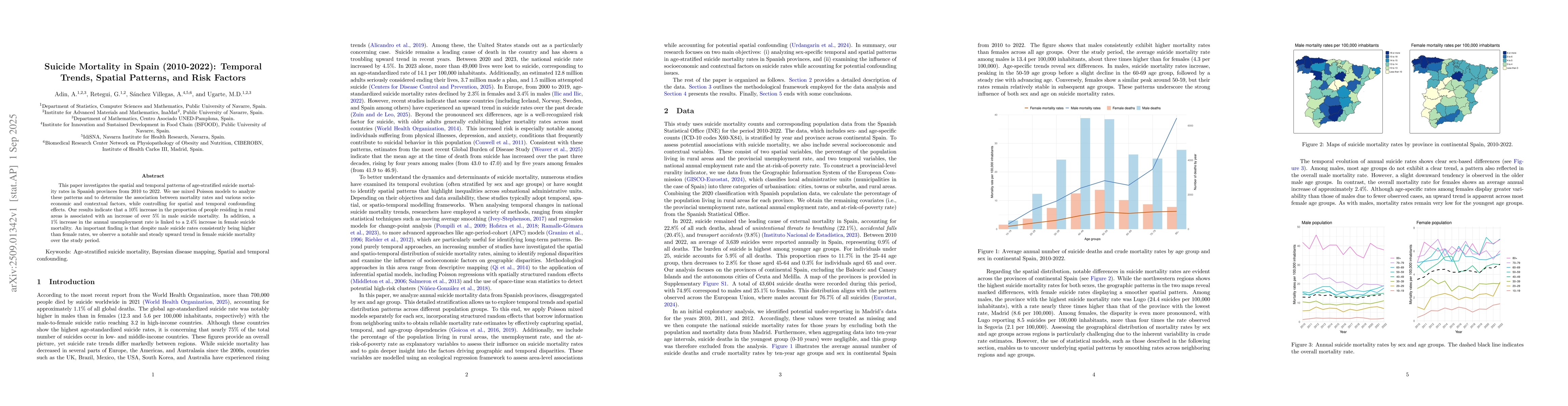 This paper investigates the spatial and temporal patterns of age-stratified suicide mortality rates in Spanish provinces from 2010 to 2022. We use mixed Poisson models to analyze these patterns and to determine the association between mortality rates and various socioeconomic and contextual factors, while controlling for spatial and temporal confounding effects. Our results indicate that a 10% increase in the proportion of people residing in rural areas is associated with an increase of over 5% in male suicide mortality. In addition, a 1% increase in the annual unemployment rate is linked to a 2.4% increase in female suicide mortality. An important finding is that despite male suicide rates consistently being higher than female rates, we observe a notable and steady upward trend in female suicide mortality over the study period.