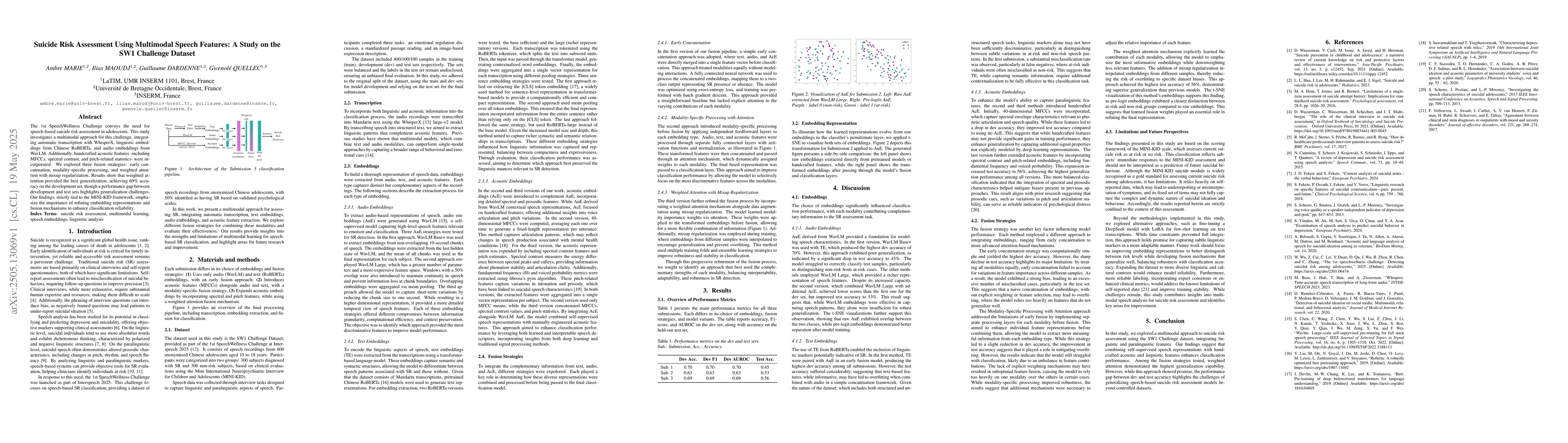 A study developed a multimodal speech feature approach to assess suicide risk in adolescents, achieving 69% accuracy on the development set but highlighting challenges in generalization. The findings emphasize the importance of refining embedding representations and fusion mechanisms for reliable classification.