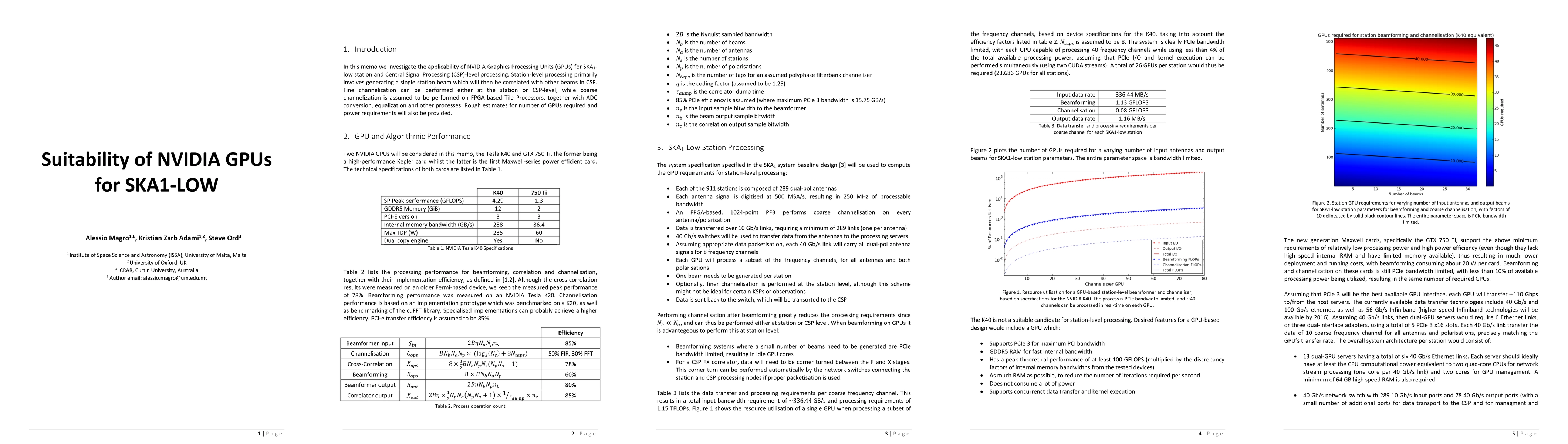 In this memo we investigate the applicability of NVIDIA Graphics Processing Units (GPUs) for SKA1-Low station and Central Signal Processing (CSP)-level processing. Station-level processing primarily involves generating a single station beam which will then be correlated with other beams in CSP. Fine channelisation can be performed either at the station of CSP-level, while coarse channelisation is assumed to be performed on FPGA-based Tile Processors, together with A/D conversion, equilisation and other processes. Rough estimates for number of GPUs required and power requirements will also be provided.
