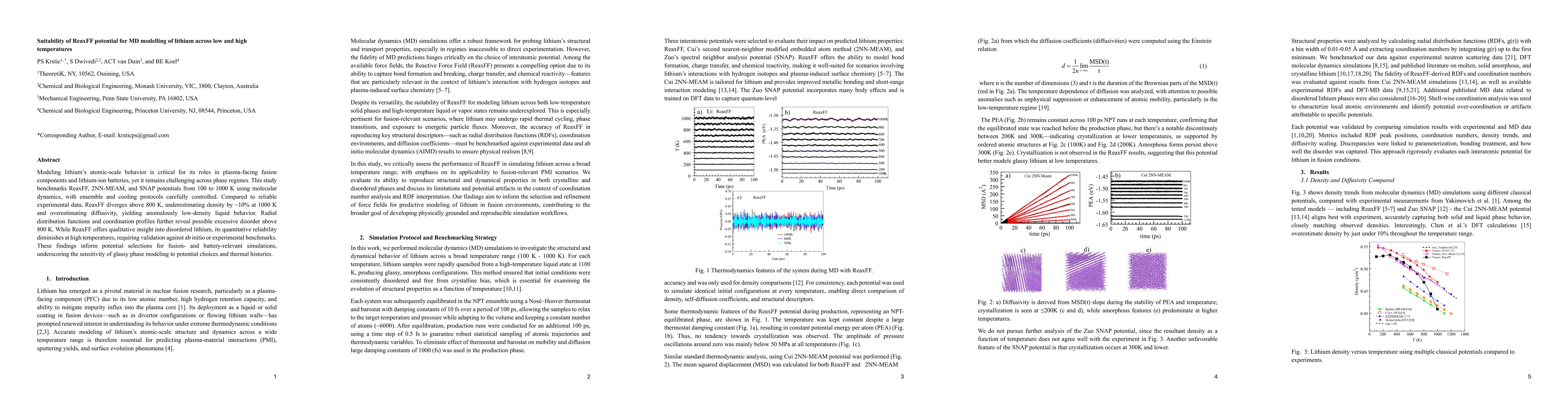 Modeling lithium's atomic-scale behavior is critical for its roles in plasma-facing fusion components and lithium-ion batteries, yet it remains challenging across phase regimes. This study benchmarks ReaxFF, 2NN-MEAM, and SNAP potentials from 100 to 1000 K using molecular dynamics, with ensemble and cooling protocols carefully controlled. Compared to reliable experimental data, ReaxFF diverges above 800 K, underestimating density by ~10% at 1000 K and overestimating diffusivity, yielding anomalously low-density liquid behavior. Radial distribution functions and coordination profiles further reveal possible excessive disorder above 800 K. While ReaxFF offers qualitative insight into disordered lithium, its quantitative reliability diminishes at high temperatures, requiring validation against ab initio or experimental benchmarks. These findings inform potential selections for fusion- and battery-relevant simulations, underscoring the sensitivity of glassy phase modeling to potential choices and thermal histories.
