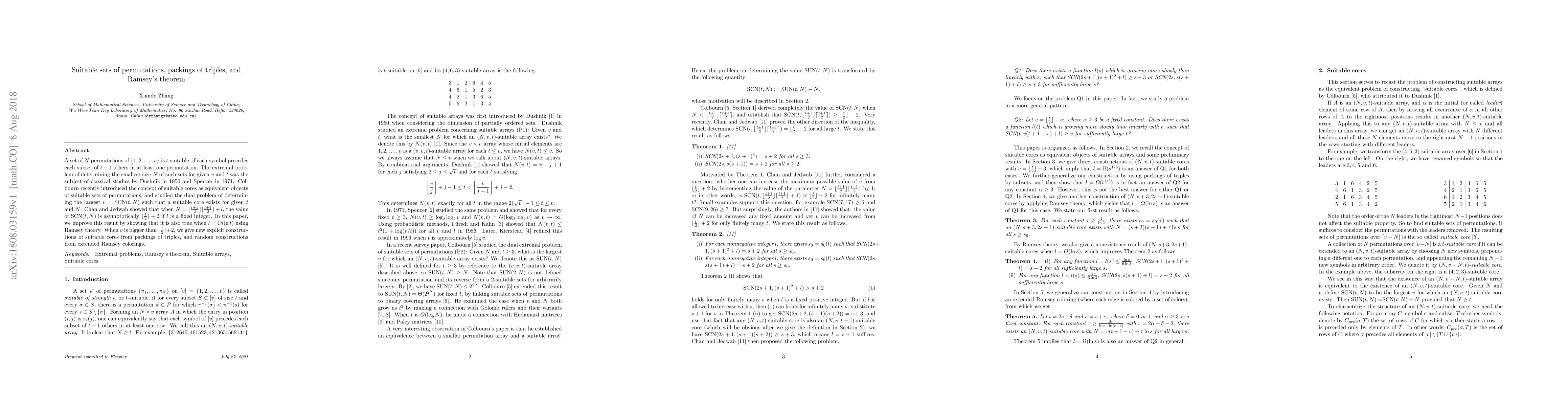 A set of $N$ permutations of $\{1,2,\ldots,v\}$ is $t$-suitable, if each symbol precedes each subset of $t-1$ others in at least one permutation. The extremal problem of determining the smallest size $N$ of such sets for given $v$ and $t$ was the subject of classical studies by Dushnik in 1950 and Spencer in 1971. Colbourn recently introduced the concept of suitable cores as equivalent objects of suitable sets of permutations, and studied the dual problem of determining the largest $v=\text{SCN}(t,N)$ such that a suitable core exists for given $t$ and $N$. Chan and Jedwab showed that when $N=\lfloor\frac{t+1}{2}\rfloor\lceil\frac{t+1}{2}\rceil+l$, the value of SCN$(t,N)$ is asymptotically $\lfloor\frac{t}{2}\rfloor+2$ if $l$ is a fixed integer. In this paper, we improve this result by showing that it is also true when $l=O(\ln t)$ using Ramsey theory. When $v$ is bigger than $\lfloor\frac{t}{2}\rfloor+2$, we give new explicit constructions of suitable cores from packings of triples, and random constructions from extended Ramsey colorings.