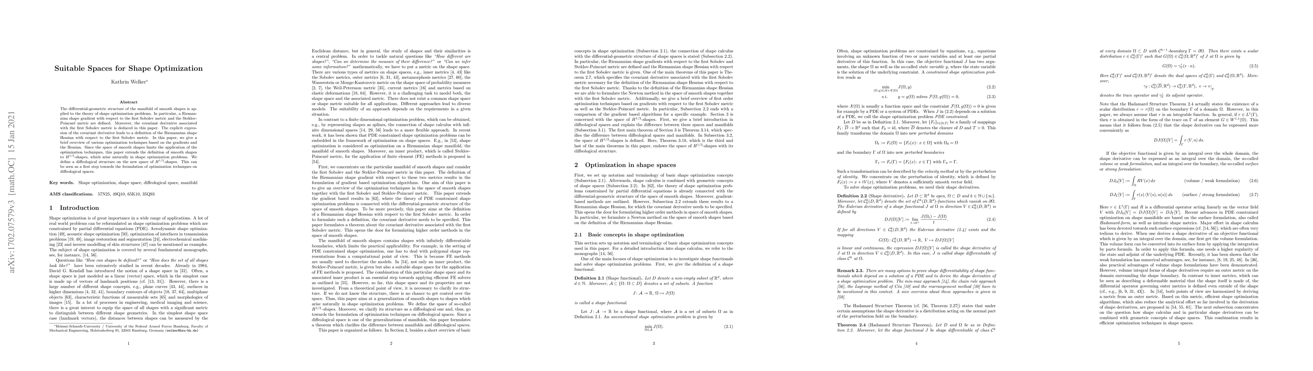 The differential-geometric structure of the manifold of smooth shapes is applied to the theory of shape optimization problems. In particular, a Riemannian shape gradient with respect to the first Sobolev metric and the Steklov-Poincar\'{e} metric are defined. Moreover, the covariant derivative associated with the first Sobolev metric is deduced in this paper. The explicit expression of the covariant derivative leads to a definition of the Riemannian shape Hessian with respect to the first Sobolev metric. In this paper, we give a brief overview of various optimization techniques based on the gradients and the Hessian. Since the space of smooth shapes limits the application of the optimization techniques, this paper extends the definition of smooth shapes to $H^{1/2}$-shapes, which arise naturally in shape optimization problems. We define a diffeological structure on the new space of $H^{1/2}$-shapes. This can be seen as a first step towards the formulation of optimization techniques on diffeological spaces.